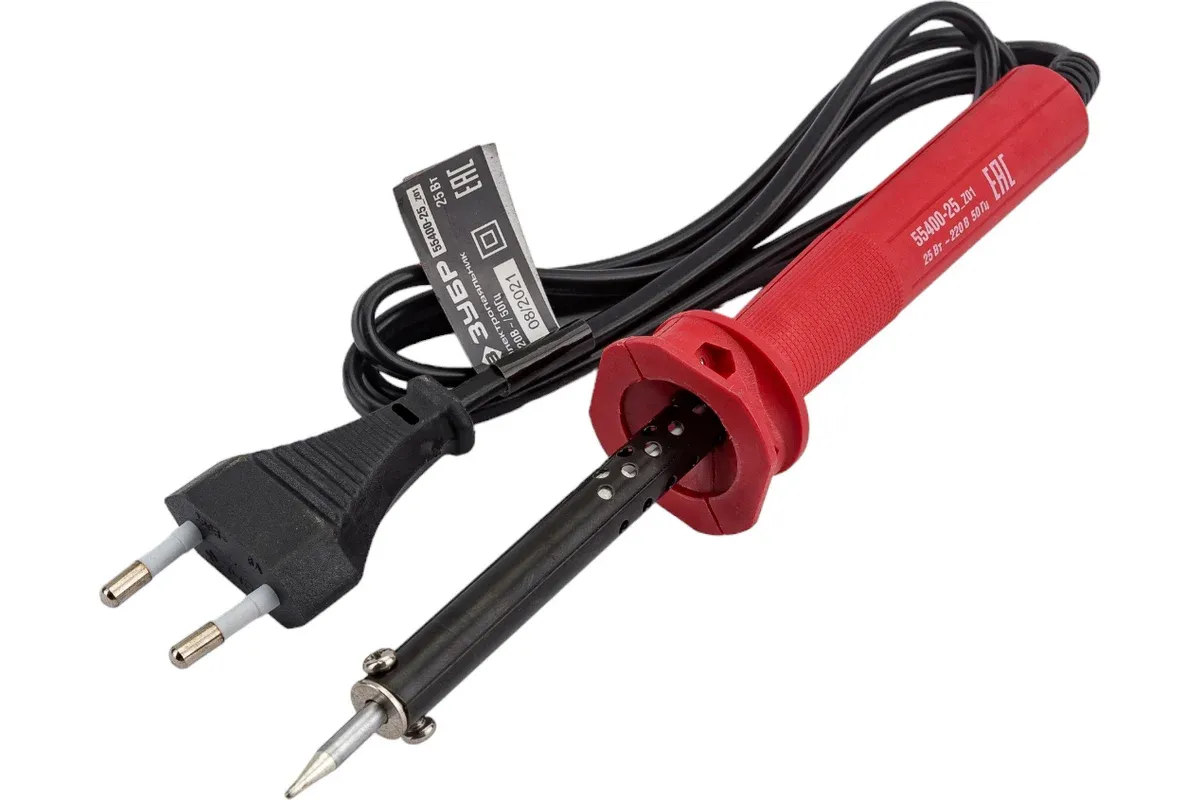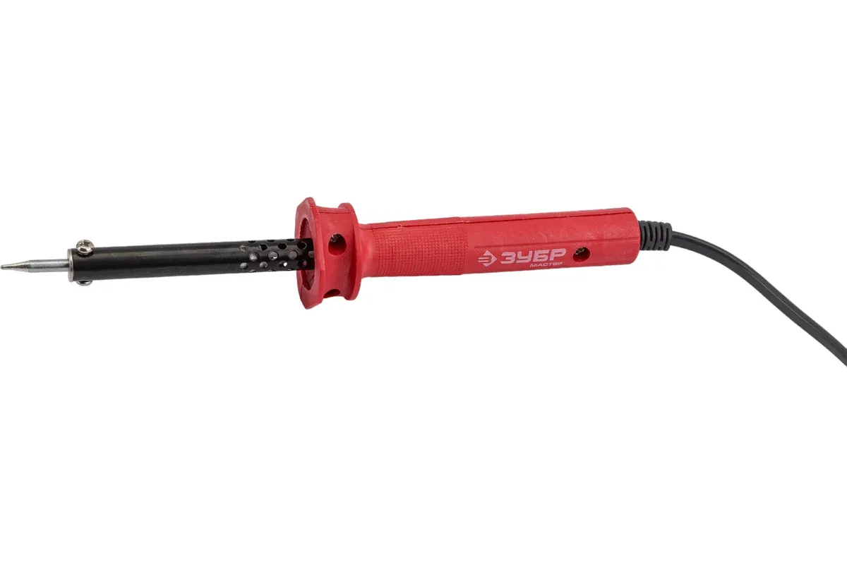 Электропаяльник ЗУБР, арт. 55400-25_z01 серия _Мастер_ применяется для пайки радиодеталей и проводов. Электропаяльники торговой марки ЗУБР изготовлены из современных долговечных материалов. Высококачественный нагревательный элемент обеспечивает быстрый нагрев рабочей части и длительный срок службы инструмента.