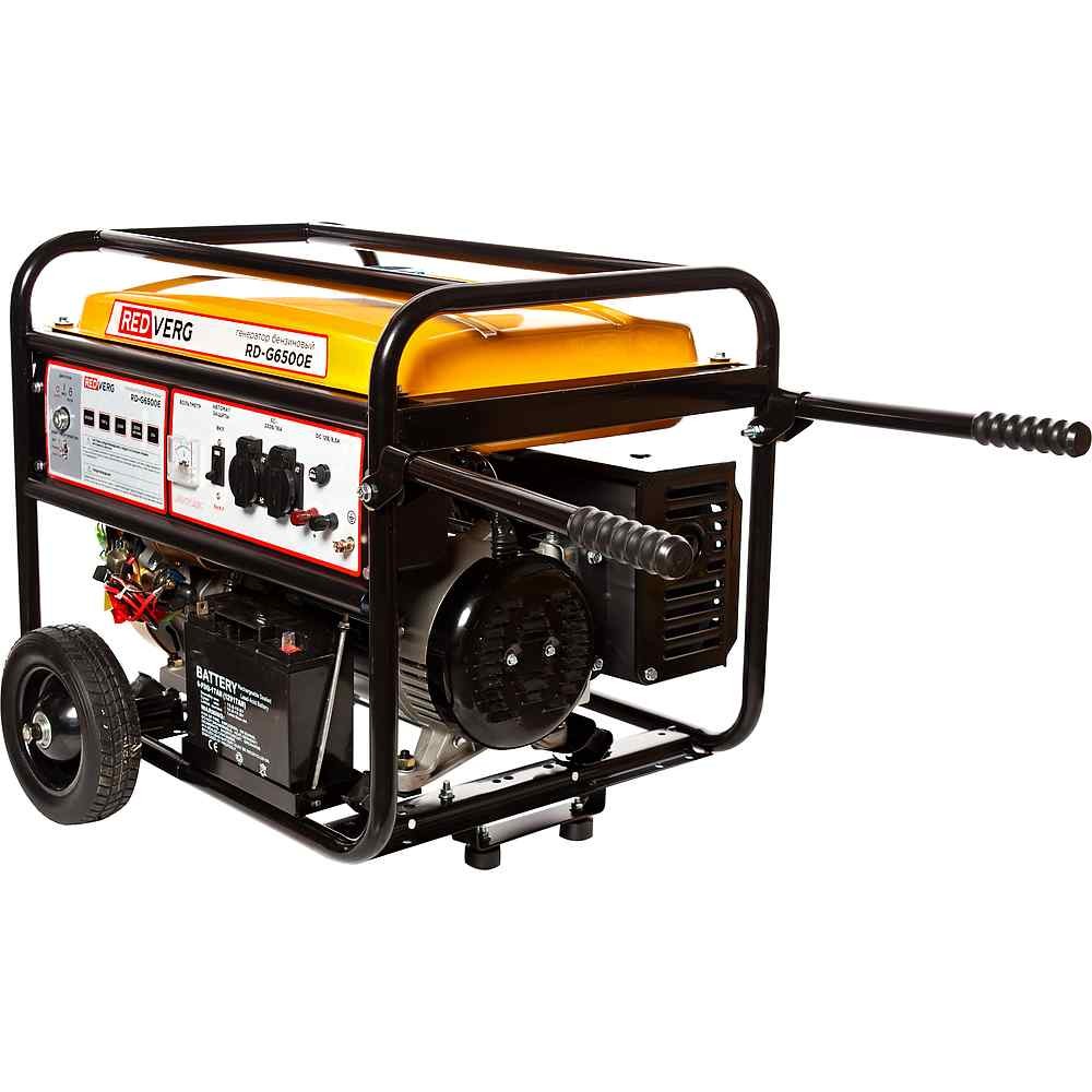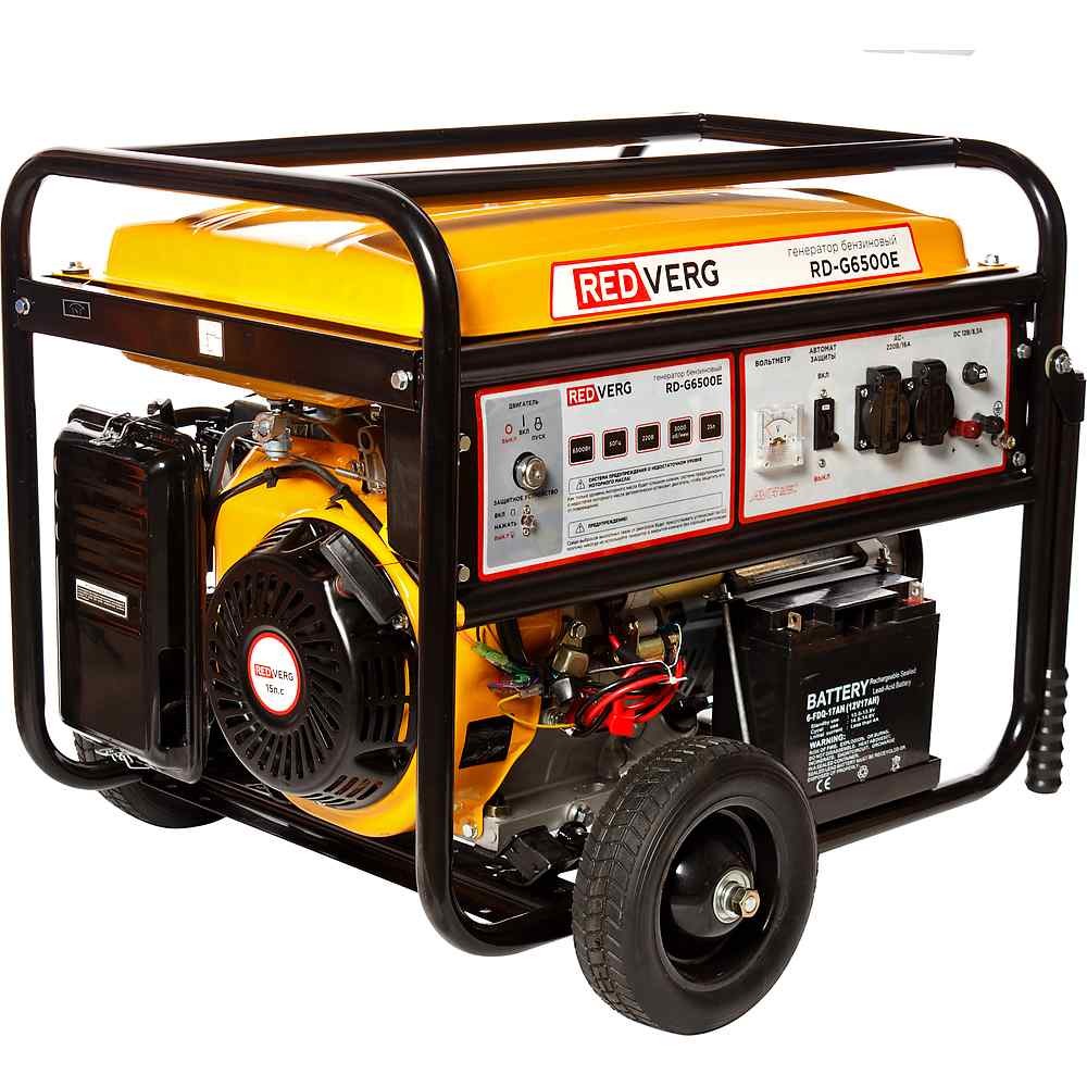 <div class="catalog-product-attributes__white-gradient"></div> Бензиновый генератор REDVERG RD-G6500E предназначен для получения электроэнергии в местах, где отсутствуют электросети, или в походных условиях. Этот прибор принято использовать на дачах, стройплощадках и в частных домах. Автоматический регулятор напряжения обеспечивает экономичную и бесперебойную работу двигателя при разных нагрузках, выравнивает напряжение на выходе при увеличении нагрузки. Модель оборудована системой электрозапуска предназначенной для лёгкого запуска даже в холодное время года. Комплектуется транспортировочными колёсами и рукоятками.