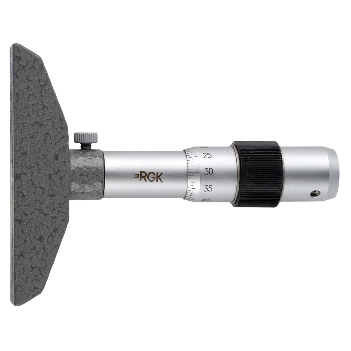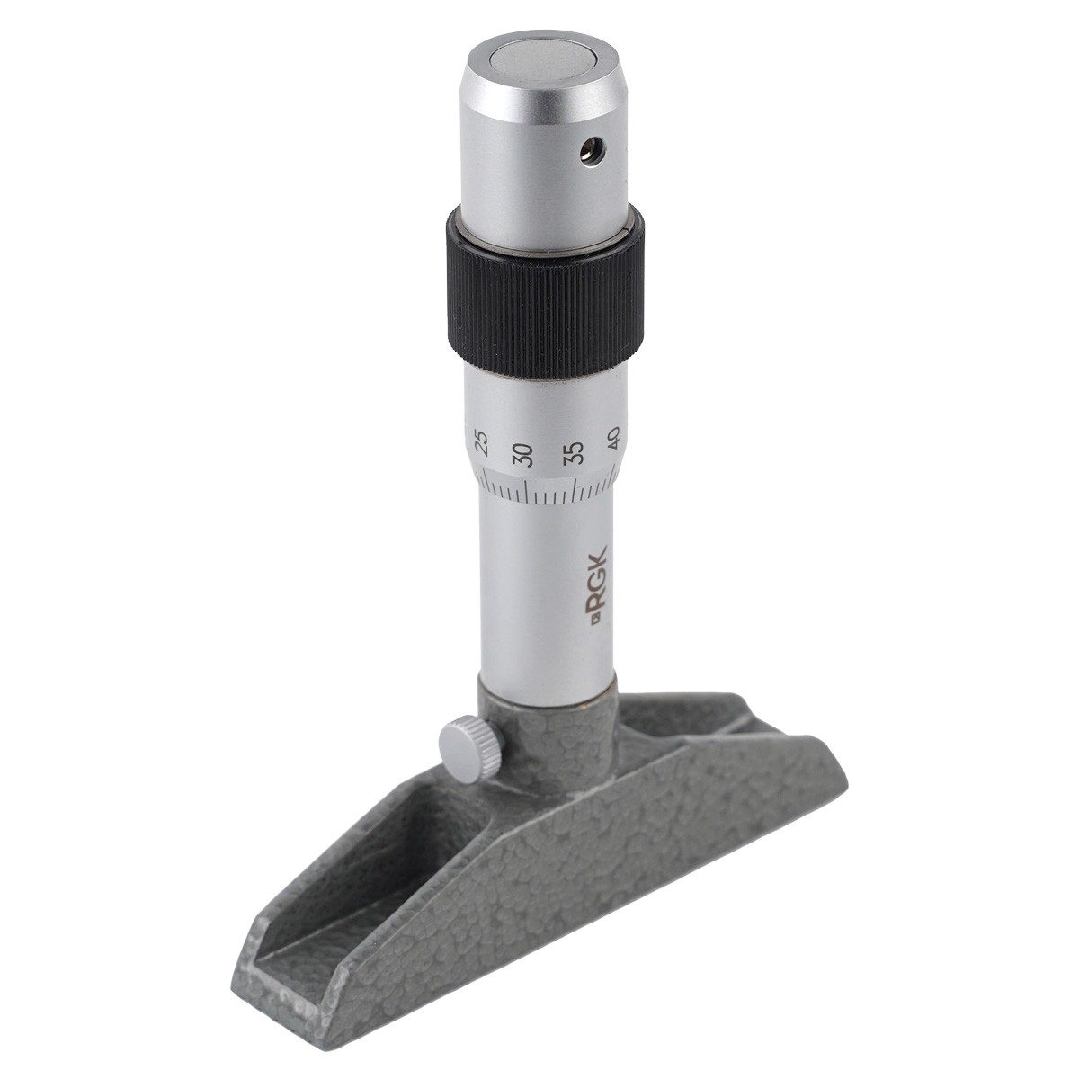 <div class="catalog-product-attributes__white-gradient"></div> Глубиномер микрометрический RGK GM-50 представляет собой механический измерительный прибор, который может использоваться в ходе высокоточных работ по обработке металлов и прочих материалов, обеспечивая контроль геометрических параметров изделий с погрешностью, не превышающей ±4 мкм. Инструмент оборудован стандартной микрометрической головкой с максимальным вылетом до 25 мм. В отличие от младшей модели GM-25, для измерений в пределах от 25 до 50 мм поставляется дополнительный стержень с увеличенной длиной вылета. При необходимости, возможно дальнейшее повышение пределов измерения инструмента путем его дооснащения сменными измерительными элементами нужного типоразмера. Конструкционные особенности В качестве отсчетной плоскости в глубинометре RGK GM-50 используется опорная поверхность основания, выполненная в прямоугольной форме с длинной стороной 85 мм. В месте запрессовки отсчетного устройства предусмотрен винтовой фиксатор. Для удобства барабан ос |