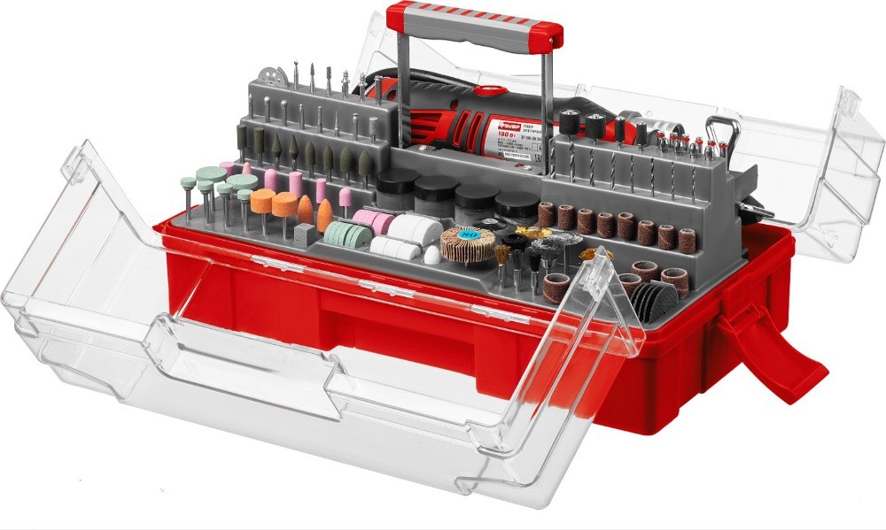 Электронная регулировка оборотов Компактные размеры и малый вес Эргономичный дизайн Быстрая замена угольных щеток Работа по металлу, стеклу, керамике, дереву, пластику Комплект мини-насадок Транспортировочный кейс |
