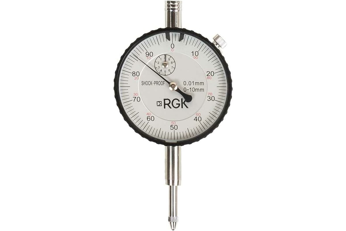 С индикатором часового типа RGK CH-10 удобно работать благодаря крупным цифрам, по которым можно комфортно считывать результаты измерений, не напрягая зрение. Предусмотрен дополнительный циферблат, который отображает количество полных оборотов основной стрелки. Наконечник измерительного стержня, как и другие элементы инструмента, выполнен из высококачественной стали, отличается износостойкостью и долговечностью.