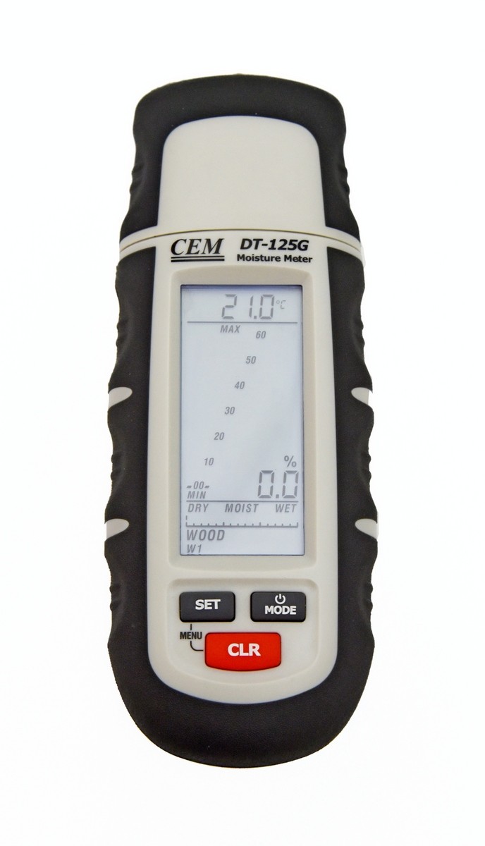 Влагомер DT-125G — измеряет процент влажности в древесине (19 видов) и строительных материалах (121 вид). В комплектации предусмотрены щупы разной формы, поэтому устройство может изучить сыпучее сырье, цементные растворы. Вычислит процент влажности в окружающей среде.