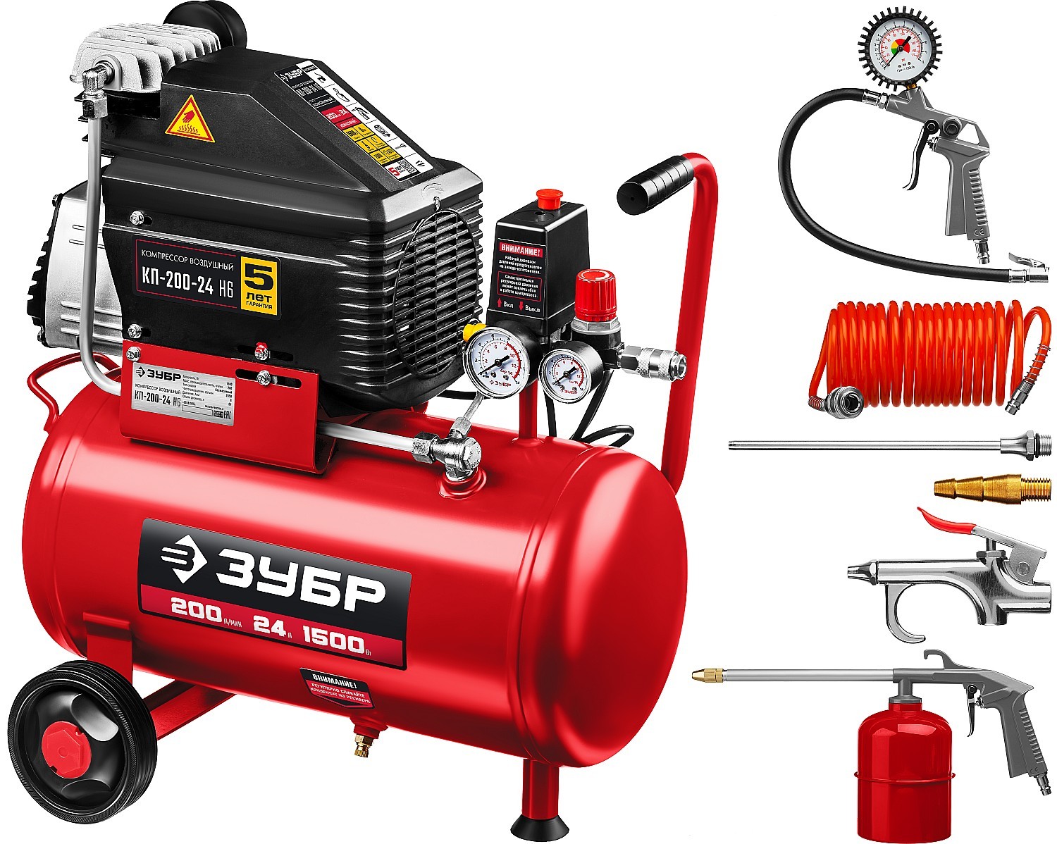 <div class="catalog-product-attributes__white-gradient"></div> Безмасляный воздушный компрессор ЗУБР КП-200-24 Н6 (200 л/мин, 24 л, 1500 Вт) обеспечивает чистый сжатый воздух без масляных примесей для покраски, подкачки шин и очистки техники. В комплекте — набор аксессуаров для быстрого старта. Прочный корпус на колесах гарантирует мобильность, а полупрофессиональная конструкция одинаково эффективна в быту, на даче и в условиях мастерской. Компактный, надежный и готов к решению задач любого уровня — от домашнего ремонта до профессионального использования, сохраняя чистоту воздуха и простоту эксплуатации. |