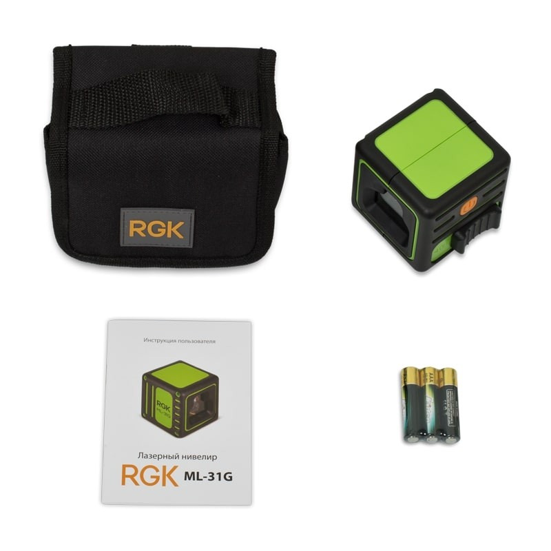 <div class="catalog-product-attributes__white-gradient"></div> Лазерный уровень RGK ML-31G – компактный прибор бытового класса. Основная сфера его применения – квартирный ремонт. Ключевой особенностью данного нивелира является луч зеленого цвета, что обеспечивает хорошую его видимость даже при ярком освещении. Особенности лазерного уровня RGK ML-31G Точность построения ±2 мм на 10 метров. Видимый диапазон работы лазера – 20 метров. Автоматическое самовыравнивание в диапазоне ± 3°. Режим работы с наклонными плоскостями. Лазерная система нивелира RGK ML-31G проецирует одну горизонтальную и одну вертикальную плоскость с углом развертки 110°. Благодаря использованию лазера зеленого цвета, проекцию хорошо видно даже при ярком освещении. Это позволяет использовать прибор на улице на малых дистанциях, например, при строительстве дачи. Маятниковый компенсатор лазерного уровня RGK ML-31G автоматически выравниваниет лазерную плоскость в диапазоне ±3°. При большем отклонении от горизонта лучи начнут мигать, что исключит |