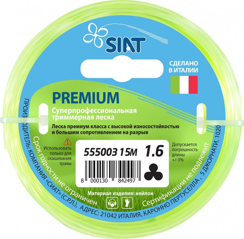 Леска для триммера SIAT Premium 1.6 мм/15м, канат - режущий элемент для косильных головок триммеров. Обладает высокой износостойкостью и большим сопротивлением на разрыв. Изготовлена из качественных материалов, имеет длительный срок эксплуатации. Благодаря уникальной крученой форме уменьшается сопротивление воздуха. Двигатель триммера быстрее развивает максимальные обороты, что увеличивает производительность. Уровень шума данной лески снижается на 50%, а так же снижается расход топлива на 30%.