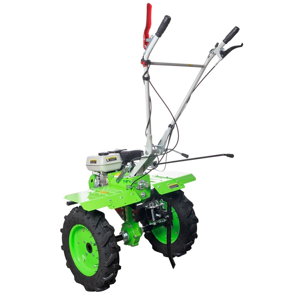 Мощный двигатель Большие пневматические колёса Увеличенная колёсная база Вал отбора мощности Шестерёнчатый редуктор в чугунном корпусе Большой топливный бак Усиленная рулевая колонка Дополнительная складная опорная ножка |