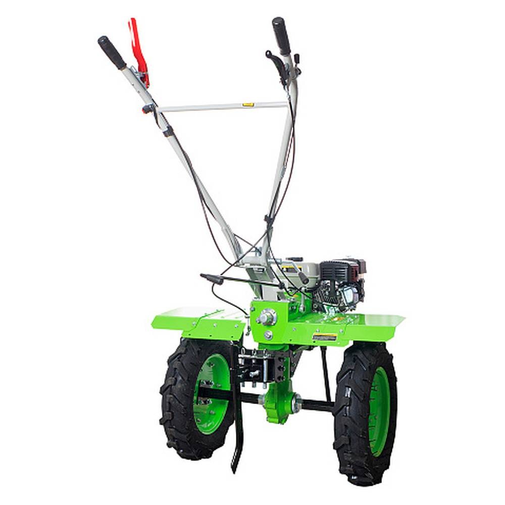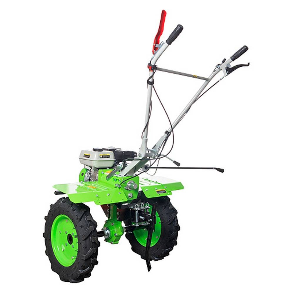 Мощный бензиновый двигатель Большие пневматические колёса Увеличенная колёсная база Вал отбора мощности Шестерёнчатый редуктор в чугунном корпусе Усиленная рулевая колонка Большой топливный бак Дисковое сцепление Дополнительная складная опорная ножка |
