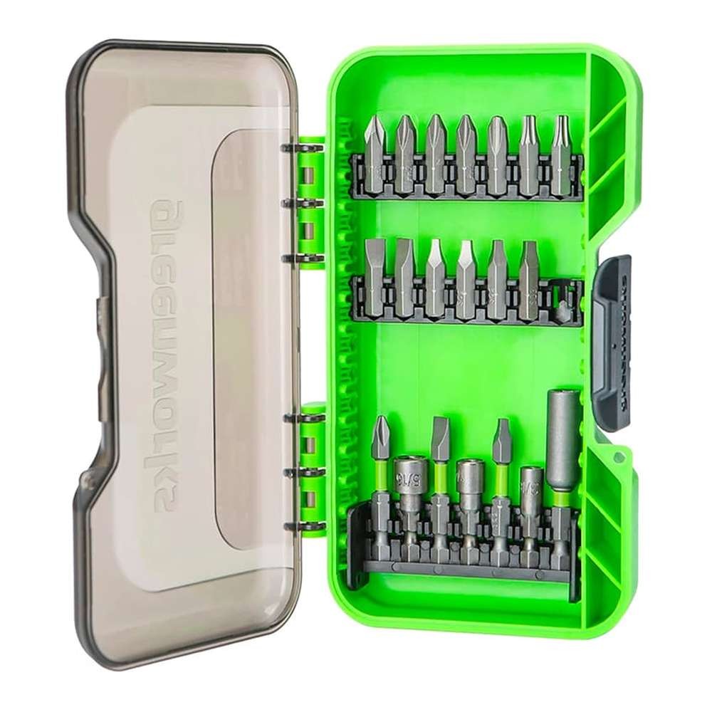 Набор бит и насадок Greenworks 20шт (2944007) содержит биты, торцевые головки и адаптеры востребованных размеров для производительной работы в мастерской или на строительном объекте. Совместимы со всеми представленными на рынке безударными и ударными дрелями-шуруповертами и ударными винтовёртами. Ударные биты 50мм имеют торсионную зону для компенсации избыточного крутящего момента и сохранения рабочей зоны метиза и биты. Торцевые головки и адаптеры изготовлены из стали S2, что обеспечивает повышенную надежность и прочность оснастки. В состав набора входят: биты 25мм (13шт) - PH1/PH2/PH3/PZ1/PZ2x3/PZ3/T20x2/T25/ SL4/SL5; ударные биты 50мм с торсионной зоной (3шт) - PZ2/T20/T25; торцевые головки с шестигранным хвостовиком 1/4" (3шт) - 5/6/8мм; ударный магнитный держатель бит (1шт); яркий и прочный кейс для хранения и перевозки.