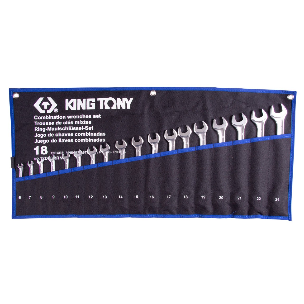Набор комбинированных ключей KING TONY, 6-24 мм, чехол из теторона, 18 предметов 12D18MRN предназначен для монтажа и демонтажа крепёжных узлов различных изделий, устройств и агрегатов. усиленный профиль рожковой части. Ключи изготовлены из специального сплава инструментальной легированной стали. Технология производства ключей включает в себя метод горячей ковки с последующей термообработкой, которая придаёт особые характеристики прочности и высокой надёжности инструментов, а хромированное покрытие защищает от коррозии и придаёт ключам матовый оттенок. Дополнительные характеристики: Двутавровый профиль в сечении корпуса 15 градусов наклон рожка 13 градусов изгиб накидной части 12-гранный профиль накидной части Ключи поставляются в прочном чехле из теторона. Люверсы для вывешивания набора обеспечивают удобное хранение. Уровень качества ключей соответствует требованиям стандартов DIN 3113, ISO 7738.