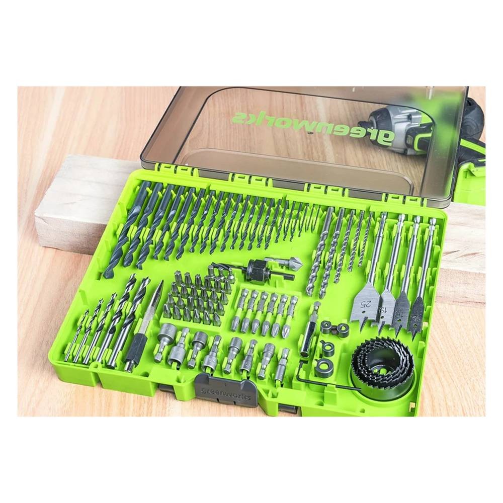 Набор сверл, бит и насадок Greenworks 90 предметов (607) содержит самую востребованную оснастку для выполнения широкого спектра работ, которые упакованы в прочный пластиковый кейс для удобной переноски и хранения. Идеально подходит для работы в мастерской со всеми представленными на рынке безударными и ударными дрелями-шуруповертами и ударными винтовёртами.