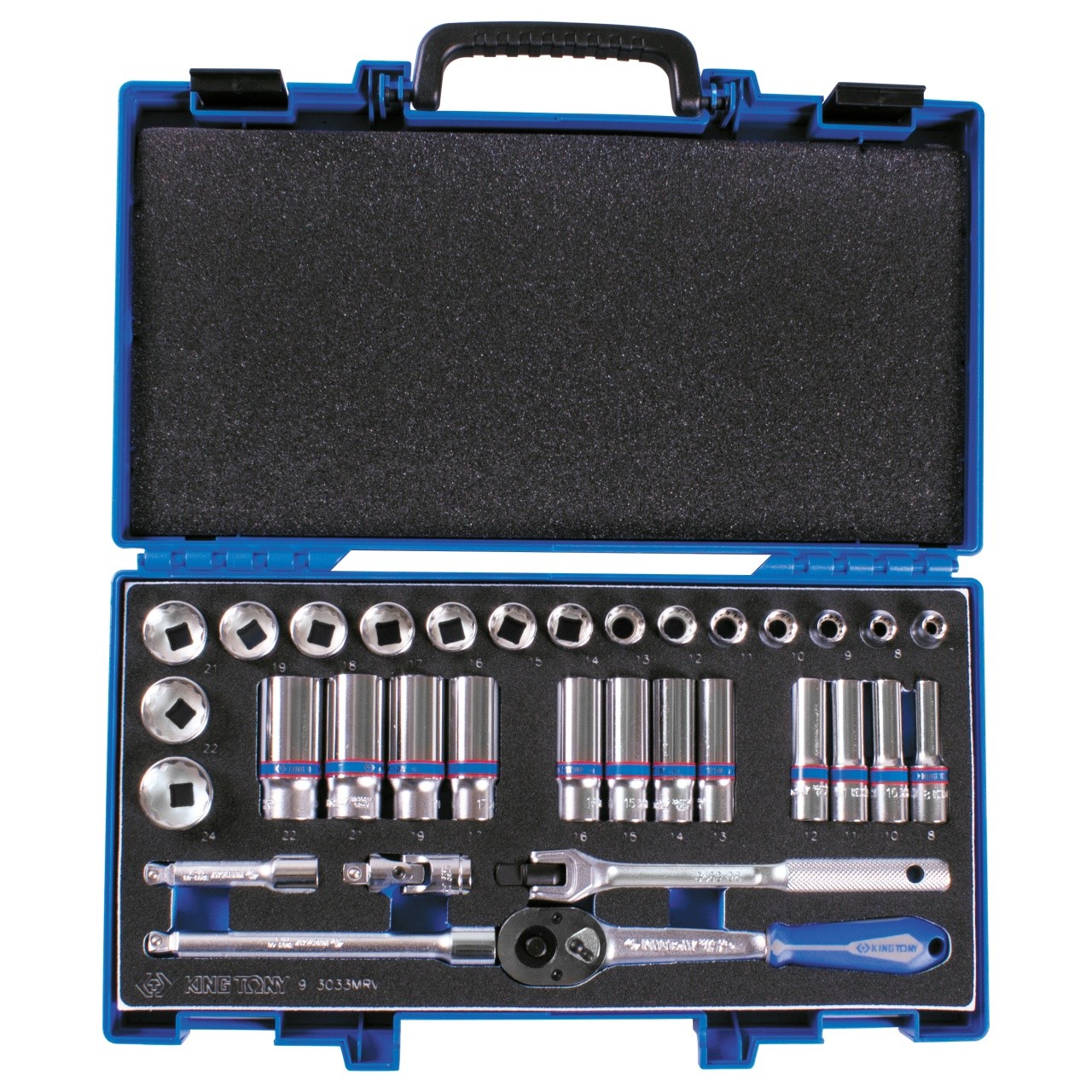 Комплектация Головки и принадлежности 3/8" Короткие 12-гранные 3330M 7, 8, 9, 10, 11, 12, 13, 14, 15, 16, 17, 18, 19, 21, 22, 24 мм Глубокие 12-гранные 3230M 8, 10, 11, 12, 13, 14, 15, 16, 17, 19, 21, 22 мм Трещотка флажковая с кнопкой 3771-08G 32 зубца, 200 мм Вороток с шарниром 3453-08F 200 мм Удлинители с шаровым окончанием 15° двухпозиционные 3293 75, 150 мм Кардан 3792 56,5 мм — — — Ложемент 85821632B 375x187 мм (№8) Пластиковый кейс 820003 389 x 230 x 66 мм Технические характеристики Материалы – инструментальная сталь Cr-V, хром, PP+TPR (рукоять трещотки), EVA (ложемент), пластик ABS (кейс) Размеры кейса – 389 x 230 x 66 мм Вес – 3,4 кг