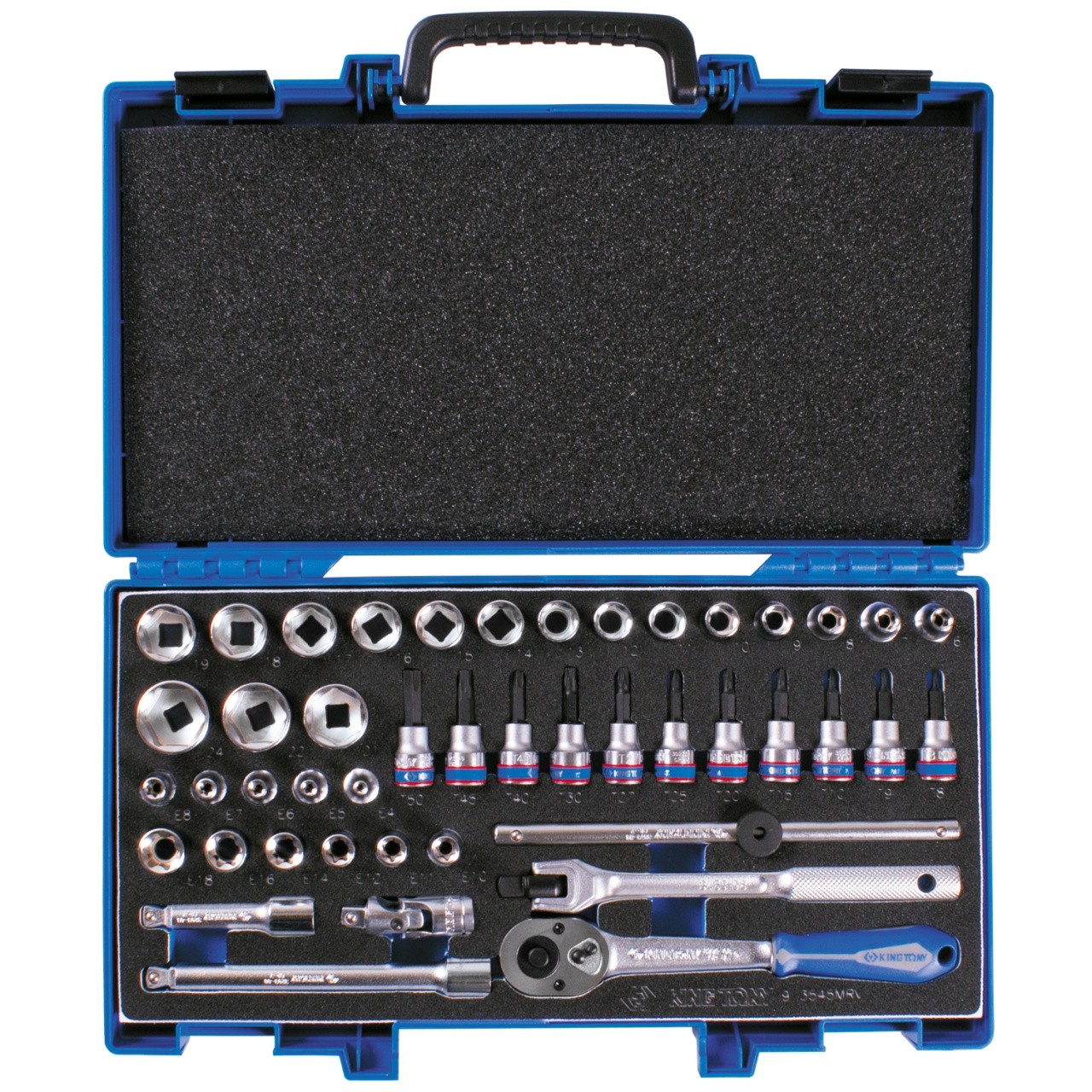 Комплектация Головки и принадлежности 3/8" Короткие 6-гранные 3335M 6, 7, 8, 9, 10, 11, 12, 13, 14, 15, 16, 17, 18, 19, 20, 21, 22, 24 мм Короткие Е-стандарт 3375M E4, E5, E6, E7, E8, E10, E11, E12, E14, E16, E18 Трещотка флажковая с кнопкой 3771-08G 32 зубца, 200 мм Вороток с шарниром 3453-08F 200 мм Вороток скользящий Т-типа 3571-08 200 мм Удлинители с шаровым окончанием 15° двухпозиционные 3293 75, 150 мм Кардан 3792 56,5 мм Насадки торцевые 3/8" 50 мм TORX 3023 T8, T9, T10, T15, T20, T25, T27, T30, T40, T45, T50 — — — Ложемент 85821532B 375x187 мм (№8) Пластиковый кейс 820003 389 x 230 x 66 мм Технические характеристики Материалы – инструментальная сталь Cr-V, хром, PP+TPR (рукоять трещотки), EVA (ложемент), пластик ABS (кейс) Размеры кейса – 389 x 230 x 66 мм Вес – 2,47 кг