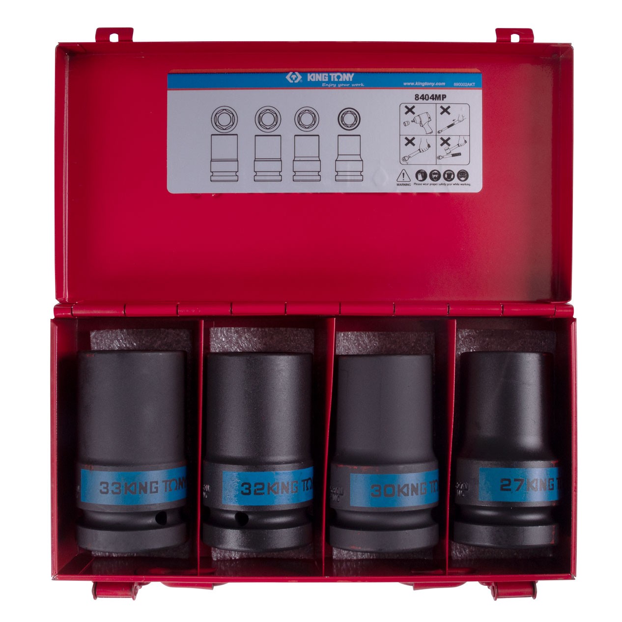Набор ударных глубоких торцевых головок 1", шестигранные, 27-33 мм, 4 предмета KING TONY 8404MP