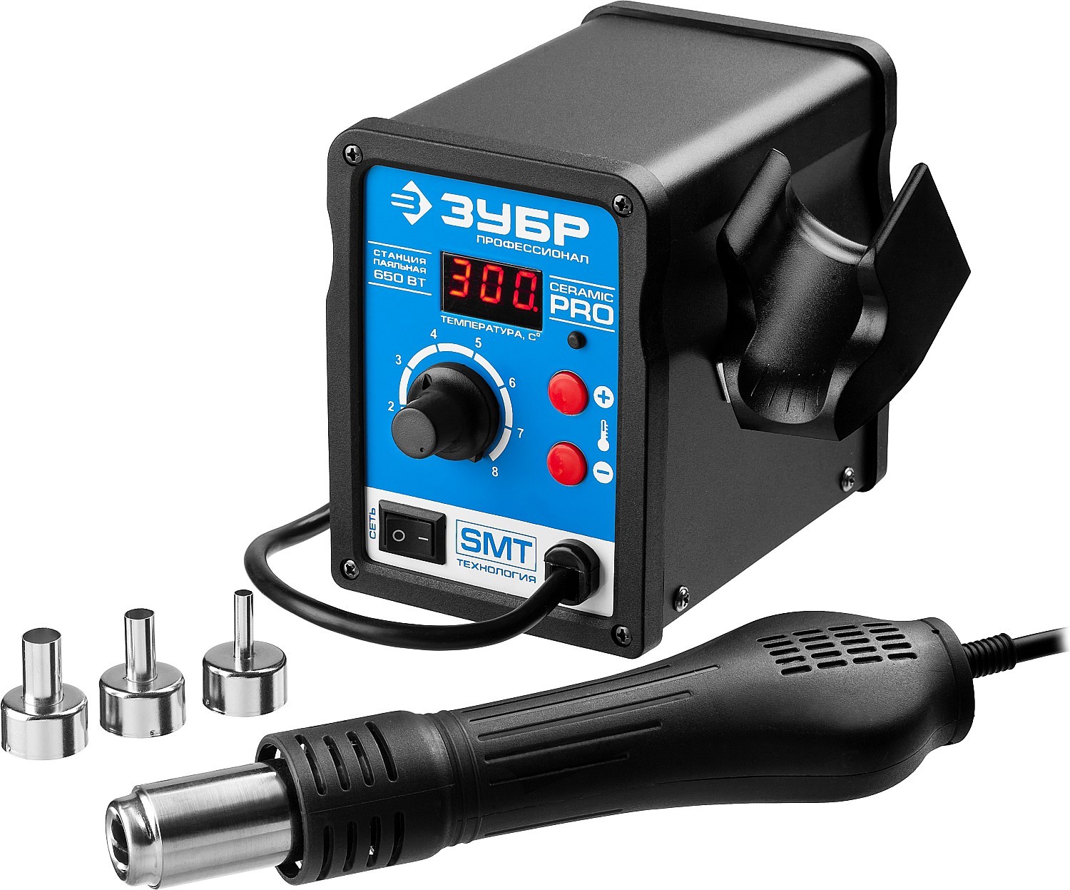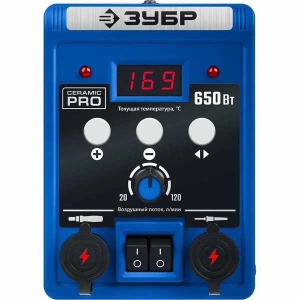 Термовоздушная цифровая паяльная станция, ЗУБР 100-500C, шаг 1C, 120л/мин, 650Вт, 3 насадки 55350 применяется для профессиональной пайки различных компонентов в корпусах (SOIC, PLCC, QFP, BGA), электронных плат и других мелких деталей. Станция имеет функцию неактивного состояния, при неиспользовании паяльника система приводится в резервное состояние готовности, которая позволяет сэкономить энергию. Стартовый разогрев осуществляется за 3-5 секунд, далее поддерживается постоянная температура, которая требуется пользователю. Проследить и настроить температуру позволяют кнопки регулировки и цифровой дисплей.