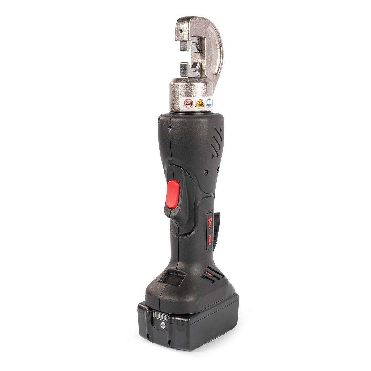 Тип инструмента: пресс аккумуляторный Вид привода: электрический Коннекторы: медные наконечники и гильзы, алюминиевые наконечники и гильзы, алюмомедные наконечники и гильзы Минимальный размер опрессовки, мм2: 4 Максимальный размер опрессовки, мм2: 70 Профиль обжима: шестигранный Особенности конструкции: стальная рабочая голова, сменные матрицы, индикатор заряда батареи, батареи в комлекте, автоматический возврат штока, вращающаяся рабочая голова, П-образная форма рабочей головы Наличие клапана АСД: 1 Матрицы в комплекте: 1 Максимальное усилие, тонн: 5 Длина инструмента, мм: 310