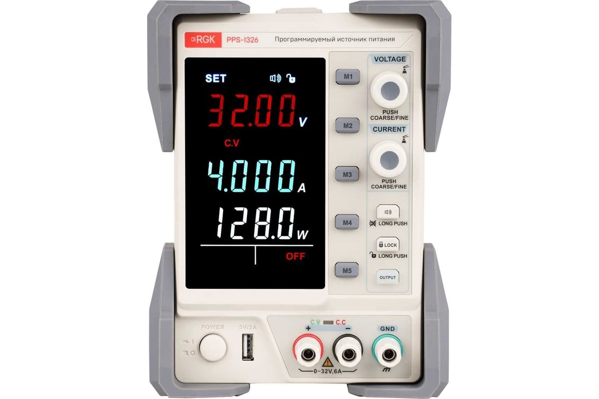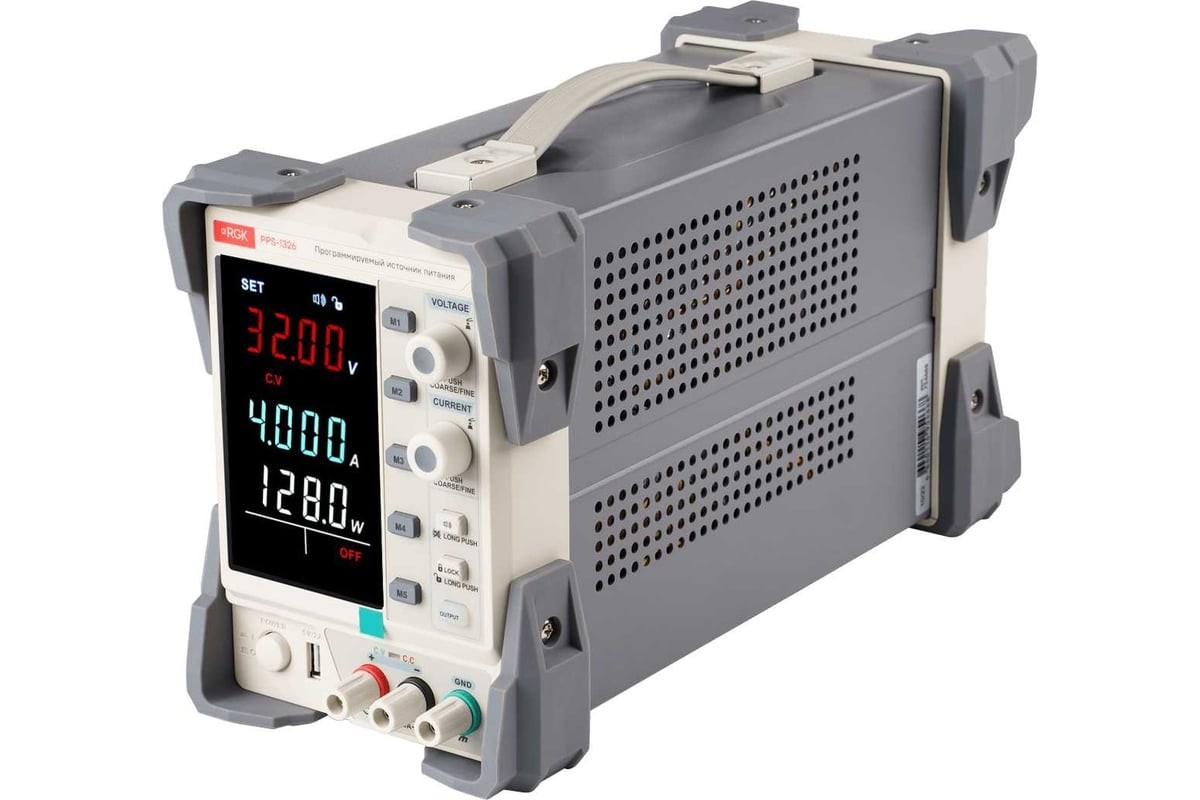 <div class="catalog-product-attributes__white-gradient"></div> Источник питания RGK PPS-1326 - программируемый одноканальный прибор линейного типа, который используется для проверки и настройки различных радиотехнических устройств. За счет широкого функционала эта модель подходит как для радиолюбительской практики, так и лабораторного использования или применения в сервисных центрах.<br> Помимо основного канала, выходные параметры которого можно регулировать (32В/6А), источник питания постоянного тока оборудован USB-интерфейсом, ток и напряжение на котором зафиксированы на отметке 5В/2А.<br> Особенности:<br> Режимы стабилизации параметров: При изменении сопротивления нагрузки источник питания RGK PPS-1326 автоматически переходит переключение из режима стабилизации напряжения (CV) в режим стабилизации по току (СС).<br> Защита от перенапряжения и перегрузки: Устройство можно перевести в режим, при котором превышение заданного уровня силы тока или напряжения приведет к защитному отключению выходного канала. Прог |