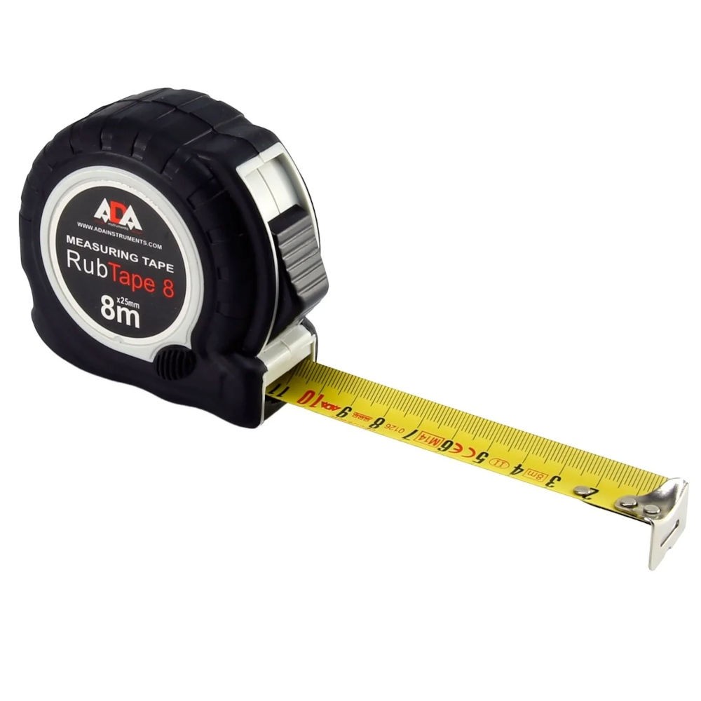 Рулетка измерительная ADA RubTape 8 8м х 25мм с фиксатором А00157 - простая, надёжная рулетка, защищённая ребристым резиновым элементом, предохраняющем корпус при падении. Имеет яркую, чёткую, хорошо читаемую измерительную шкалу и классическую систему постоянной фиксации переключателем спереди.