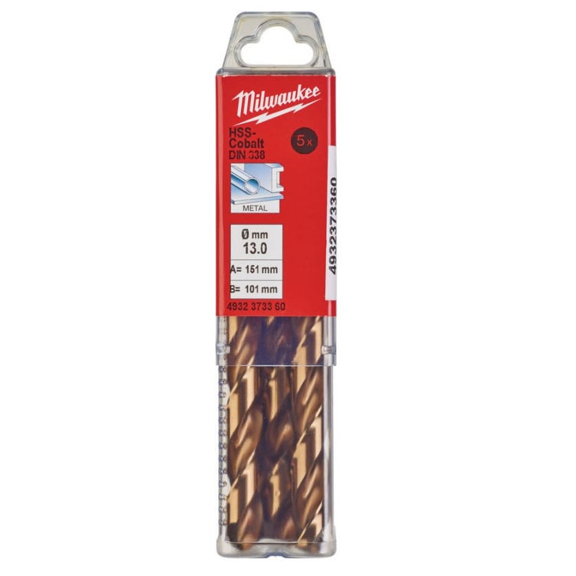 Сверло по металлу Milwaukee HSS-CO 13х151мм 5шт (360) из прочной и устойчивой к нагреву быстрорежущей стали с 5% добавлением кобальта. Применяется для сверления высоколегированных сталей и металлов с пределом прочности на разрыв свыше 1000 Н/мм2, например, нержавеющая сталь.