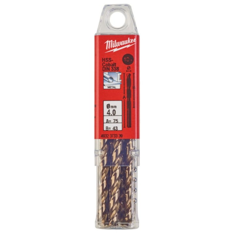 Сверло по металлу Milwaukee HSS-CO 4х75мм 10шт (339) из прочной и устойчивой к нагреву быстрорежущей стали с 5% добавлением кобальта. Применяется для сверления высоколегированных сталей и металлов с пределом прочности на разрыв свыше 1000 Н/мм2, например, нержавеющая сталь.