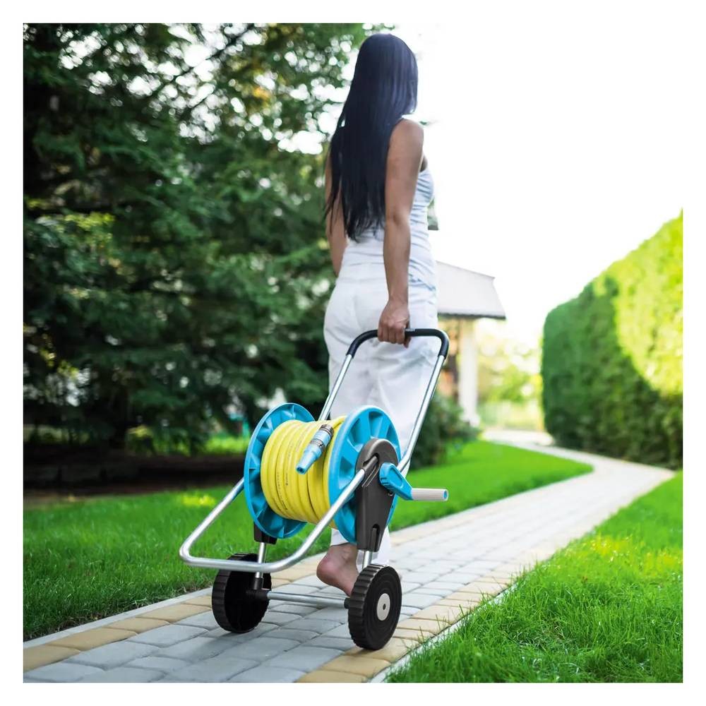 Изготовлена из алюминия Прочность конструкции Для хранения шланга 1/2 дюйма (до 45м) Угловое соединение шлангов Большие колеса |