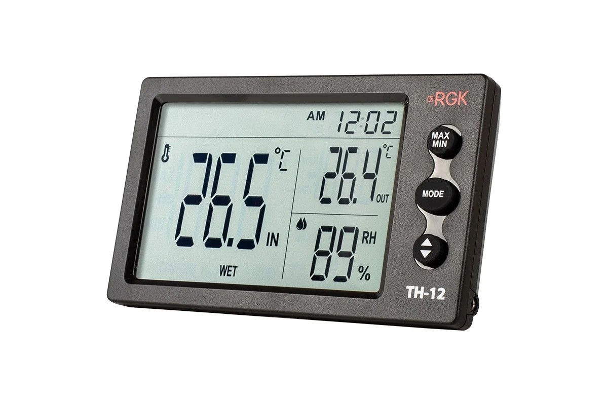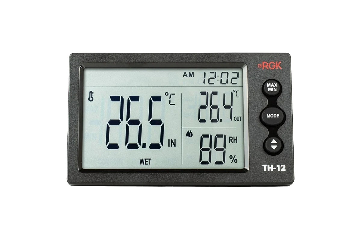 Цифровой термогигрометр RGK TH-12 с поверкой с дополнительным выносным датчиком служит для измерения температуры в диапазоне -10°С — + 50 °С и влажности в пределах от 20% до 90%. Эта модель эффективно решает задачи по контролю режима хранения на складах, оценке условий труда на производстве или в офисе. Устройство также может использоваться как надежный помощник для создания комфортного климата в быту.Преимущества моделиВыносной датчик позволяет удобно наблюдать за климатом в разных частях помещения или оценивать разницу между внутренней и наружней обстановкой. Функция отображения пиковых значений температуры, измеренных обоими сенсорами, помогает быстро понять, был ли, к примеру, нарушен режим хранения.Часы и звуковая сигнализацияФункционал прибора удачно дополнен цифровыми часами. Можно настроить устройство так, чтобы будильник напоминал о необходимости проверки климатических параметров или проведения каких-либо производственных операций. Отображение точного времени упрощает документацию данных.2 способа установкиДля монтажа цифрового термогигрометра RGK TH-12 с поверкой на стену предусмотрена специальная петля на задней панели. Надежная установка на горизонтальные поверхности обеспечивается за счет откидной подставки.