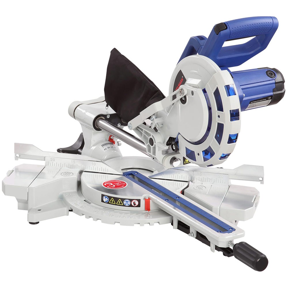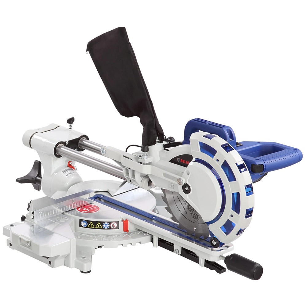 Регулировка наклона пильного диска 0-45 (влево) Ход пильного узла по горизонтали составляет 245мм Рабочий стол позволяет производить поворот -45…+45 градусов Струбцина помогает удерживать заготовку в нужном положении Для отвода стружки имеется патрубок 44мм Лазерная направляющая |
