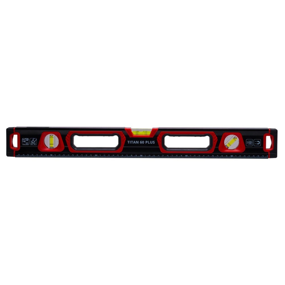 Уровень ADA TITAN 60 PLUS магнитный 600мм А00510 - отличный выбор для повседневной работы на стройплощадке. Профиль уровня имеет специальную форму с увеличенной толщиной на рабочих плоскостях, а также дополнительное ребро жесткости. Такая конструкция позволяет эффективно противостоять значительным нагрузкам на кручение, изгиб и на излом. Массивные торцевые заглушки из резины защищают от ударов с торца. Специальный вырез служит для подвешивания уровня при хранении. Мерная шкала на корпусе с обеих сторон позволяет использовать уровень в качестве линейки. Для работы на металических поверхностях (трубы, направляющие для ГКЛ) в рабочую поверхность встроены мощные магниты. Фрезерованная рабочая поверхность выполнена с высокой точностью и качеством, значительно повышает точность измерений.