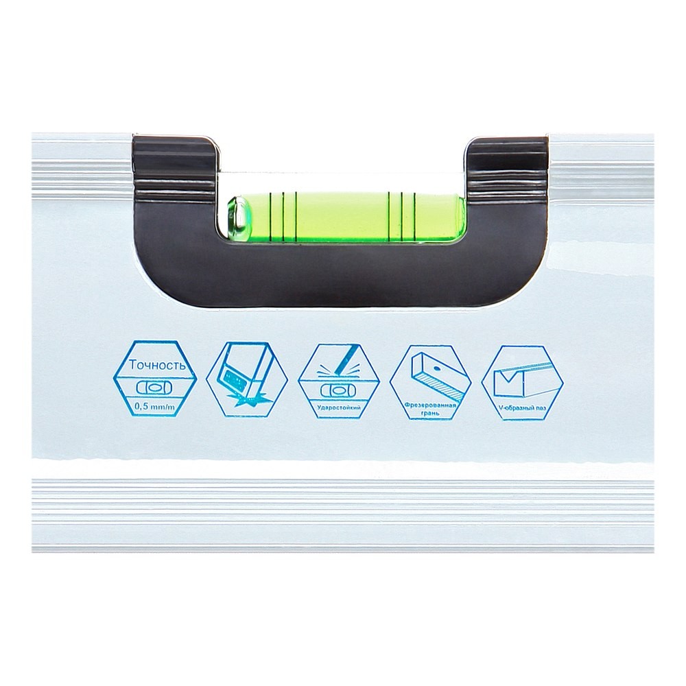 Уровень КОБАЛЬТ Экстра 2000мм 243-325 - предназначен для планирования горизонтальных, вертикальных поверхностей и поверхностей расположенных под углом 45 градусов к горизонту. Изготовлен из жесткого алюминиевого прямоугольного профиля с толщиной стенки 1,2мм сечением 30x65 мм. Профиль имеет 2 фрезерованные грани для удобства позиционирования на округлых и скользких поверхностях. Уровень имеет 3 глазка-ватерпаса: горизонтальный, вертикальный и расположенный под углом 45 градусов, точность 0,5 мм/м. Ватерпасы установлены в профиль в положении, при котором хорошо обеспечивается защита от ударов. Пластиковые заглушки на торцах уровня для предотвращения повреждения профиля. Специальная окрашенная спиртосодержащая незамерзающая жидкость, стойкая к воздействию ультрафиолета, обеспечивает хорошую стабильность и читаемость результатов. Ручки с резиновыми вставками. V-образный паз для работы с трубами. Длина общая 2000 мм.