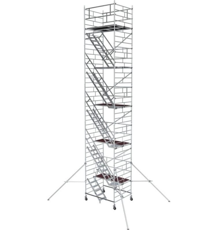 Легкий вес Наличие лестничного марша Увеличенная рабочая площадка 1.4х2 м. Нагрузка на площадку 200 кг/м2 (560 кг на настил) Сборка без инструментов, замковое крепление элементов Консоли стабилизаторы для дополнительной устойчивости Поворотные колеса со стопорами |