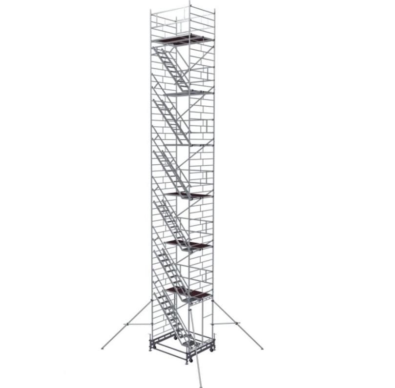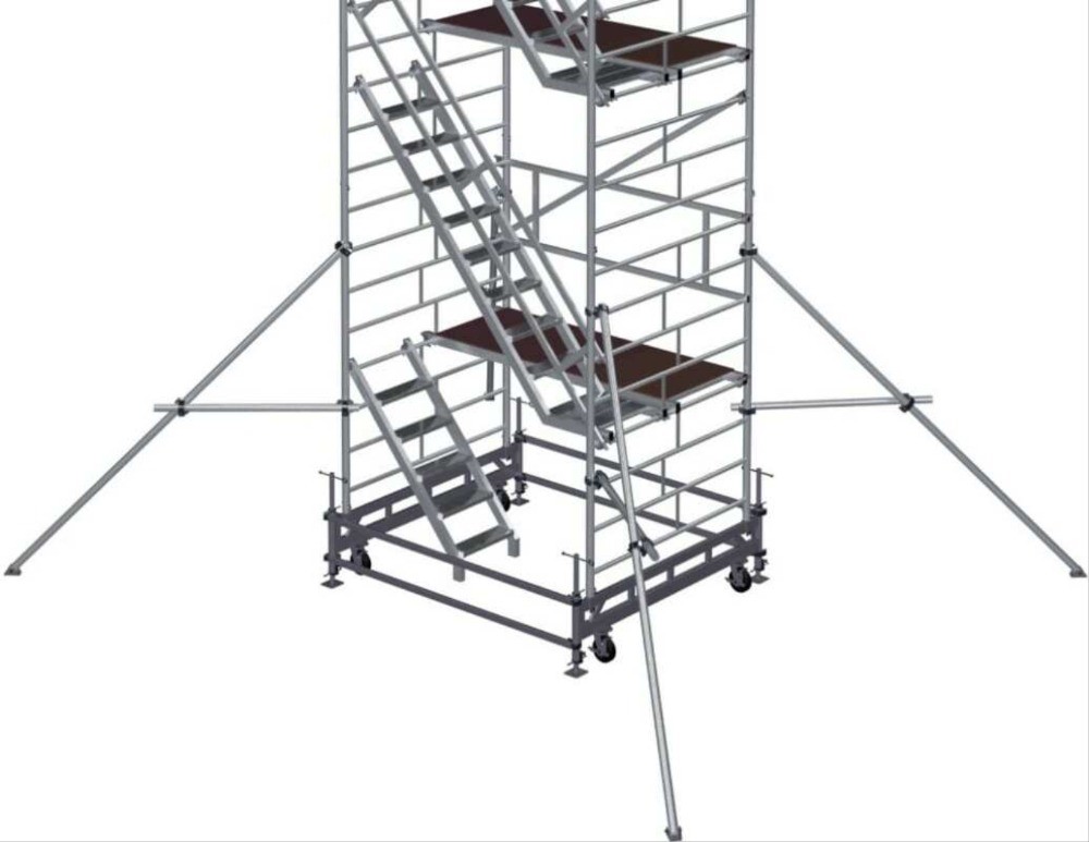 Легкий вес Комфортный подъем по наклонным лестничным маршам с широкими рифлеными ступенями Увеличенная рабочая площадка 1.4х2 м. Нагрузка на площадку 200 кг/м2 (560 кг на настил) Сборка без инструментов, замковое крепление элементов Консоли стабилизаторы для дополнительной устойчивости Поворотные колеса со стопорами Компенсация неровной опорной поверхности при помощи винтовых опор |