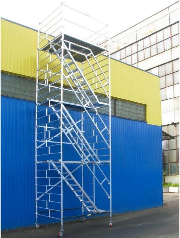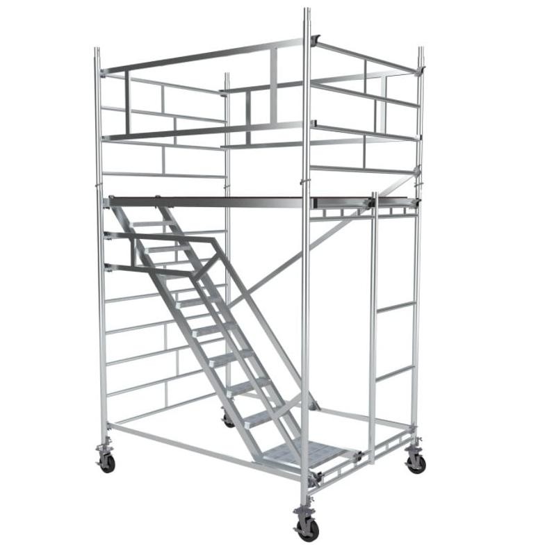 Легкий вес Комфортный подъем по наклонным лестничным маршам с широкими рифлеными ступенями Увеличенная рабочая площадка 1.4х2 м. Нагрузка на площадку 200 кг/м2 (560 кг на настил) Сборка без инструментов, замковое крепление элементов Консоли стабилизаторы для дополнительной устойчивости Поворотные колеса со стопорами Компенсация неровной опорной поверхности при помощи винтовых опор |