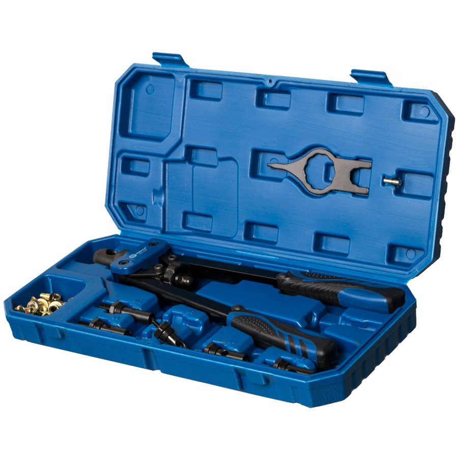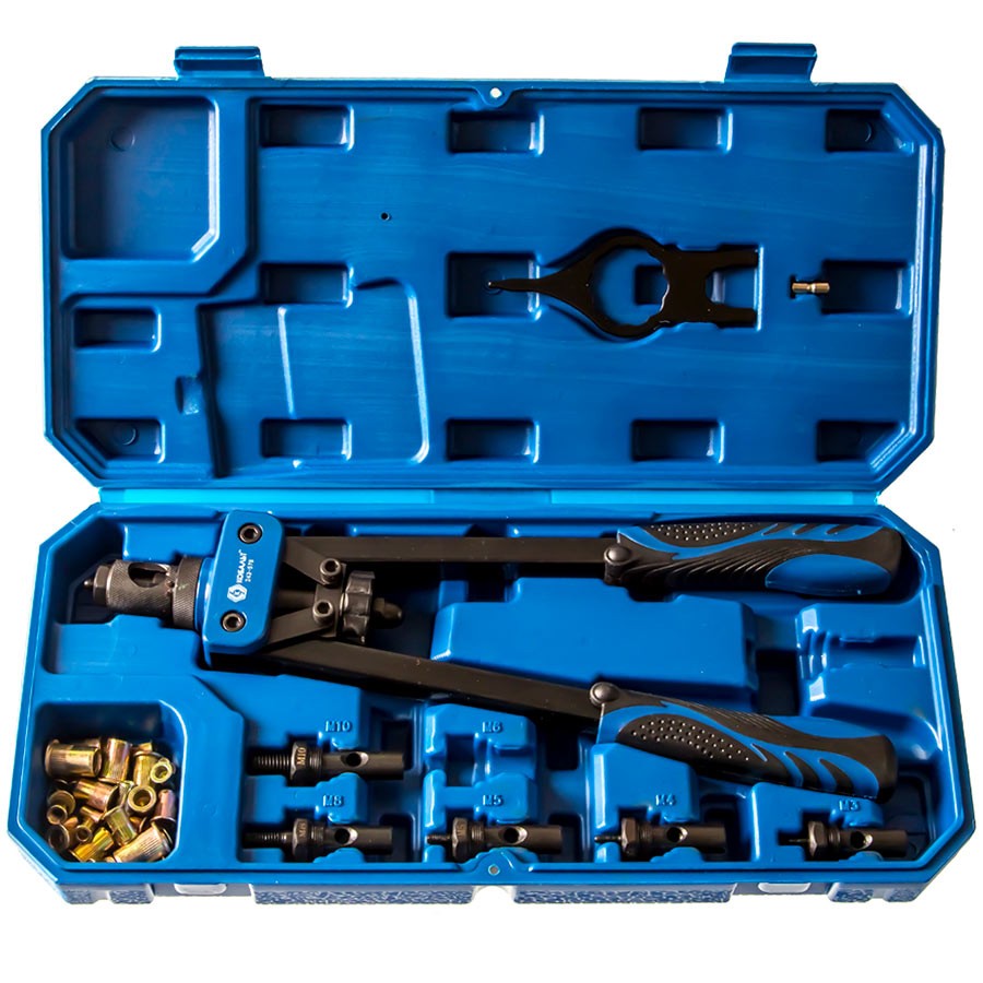 Заклепочник Кобальт 360мм 243-578 применяется для скрепления листовых материалов с помощью резьбовых заклёпок из алюминия, латуни и нержавеющей стали. Имеет усиленный алюминиевый литой корпус, прорезиненные двухкомпонентные рукоятки.