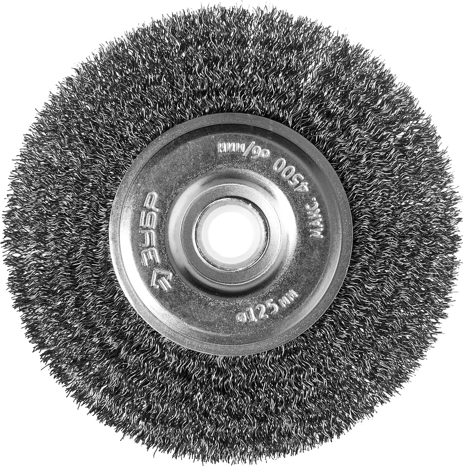 ЗУБР 125 х 12.7 мм, витая, стальная проволока 0.3 мм, дисковая щетка-крацовка для точильно-шлифовального станка, Профессионал (35185-125)