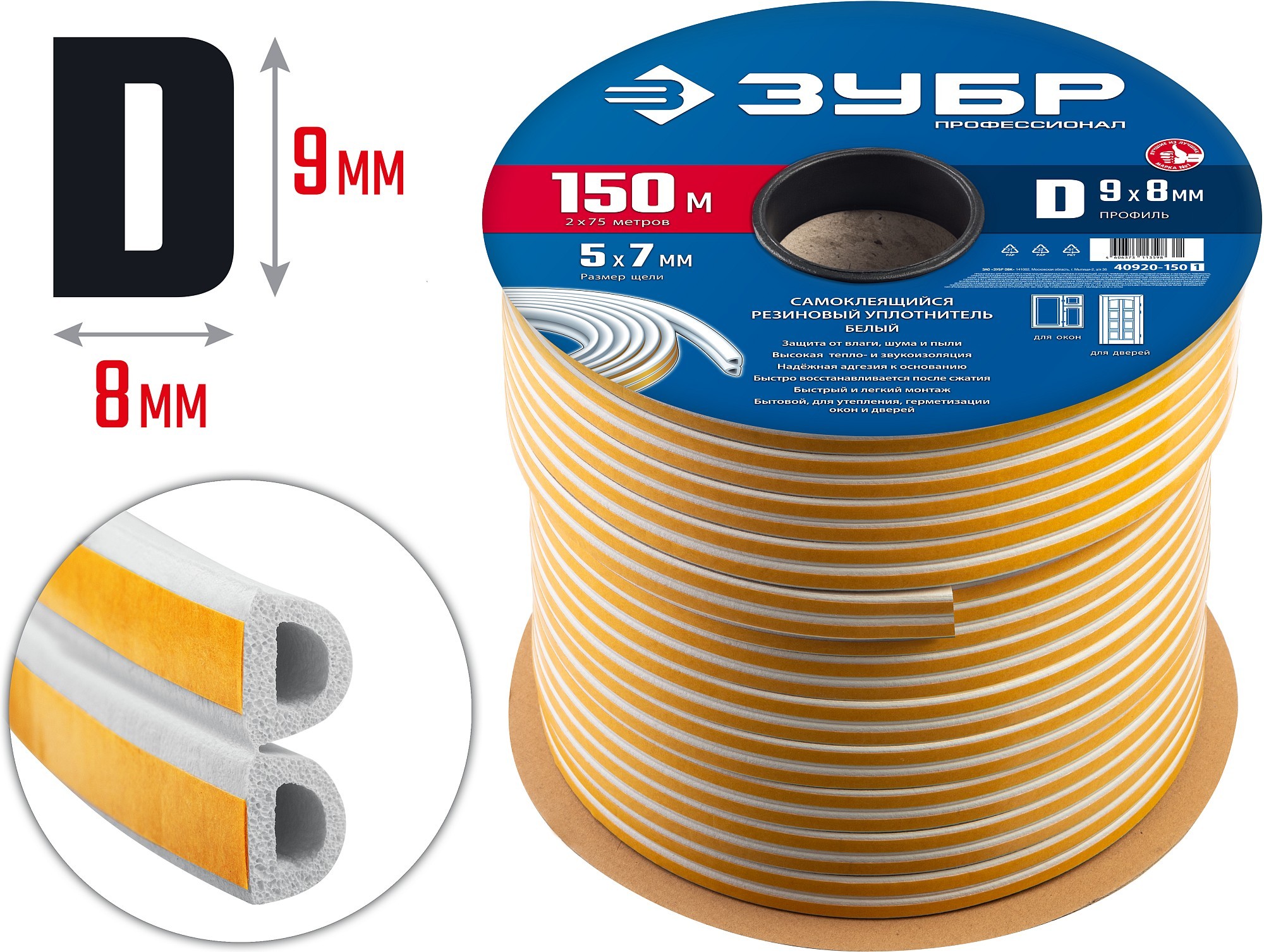 ЗУБР 150 м, D-профиль, размер 9 х 8 мм, белый, самоклеящийся резиновый уплотнитель, Профессионал (40920-150)