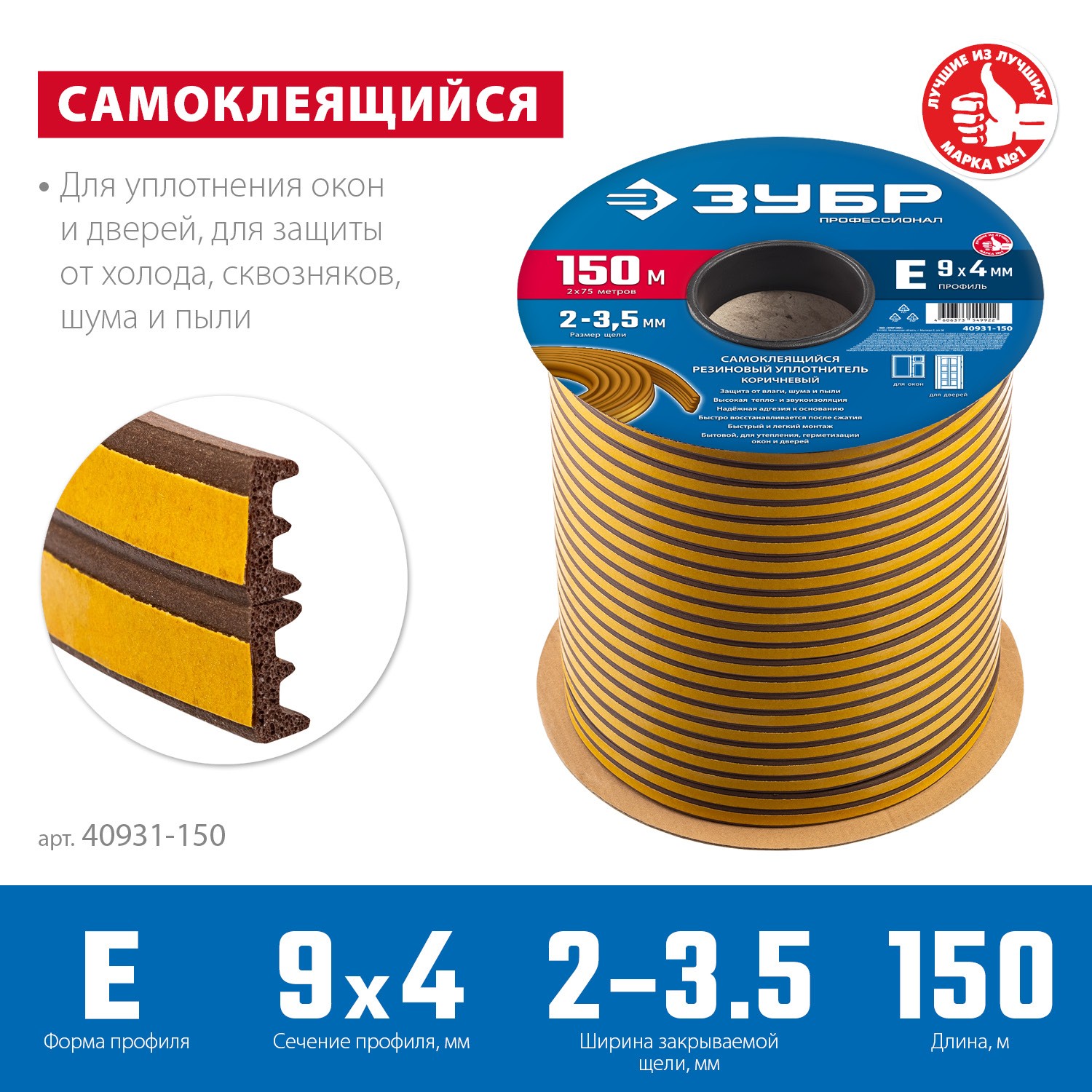ЗУБР 150 м, E-профиль, размер 9 х 4 мм, коричневый, самоклеящийся резиновый уплотнитель, Профессионал (40931-150)