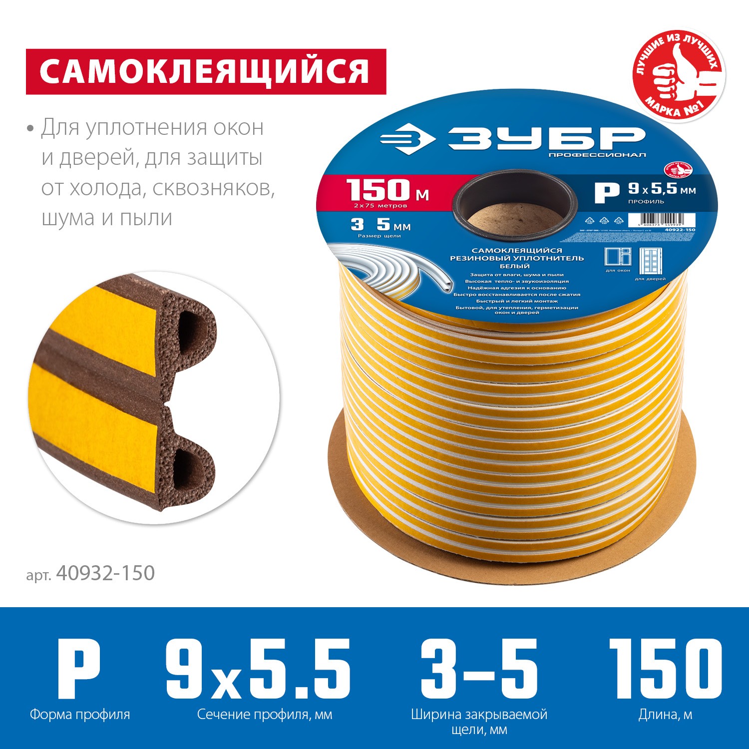 ЗУБР 150 м, P-профиль, размер 9 х 5.5 мм, коричневый, самоклеящийся резиновый уплотнитель, Профессионал (40932-150)