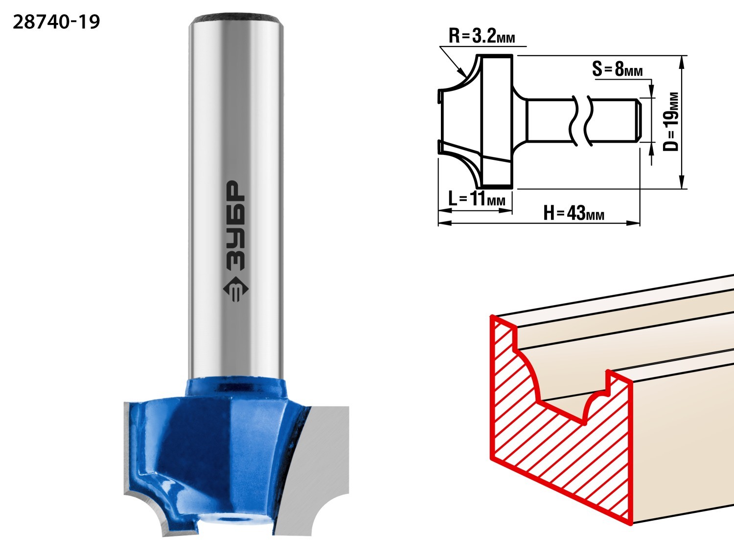 ЗУБР 19 x 11 мм, радиус 3.2 мм, фреза пазовая фасонная №1, Профессионал (28740-19)