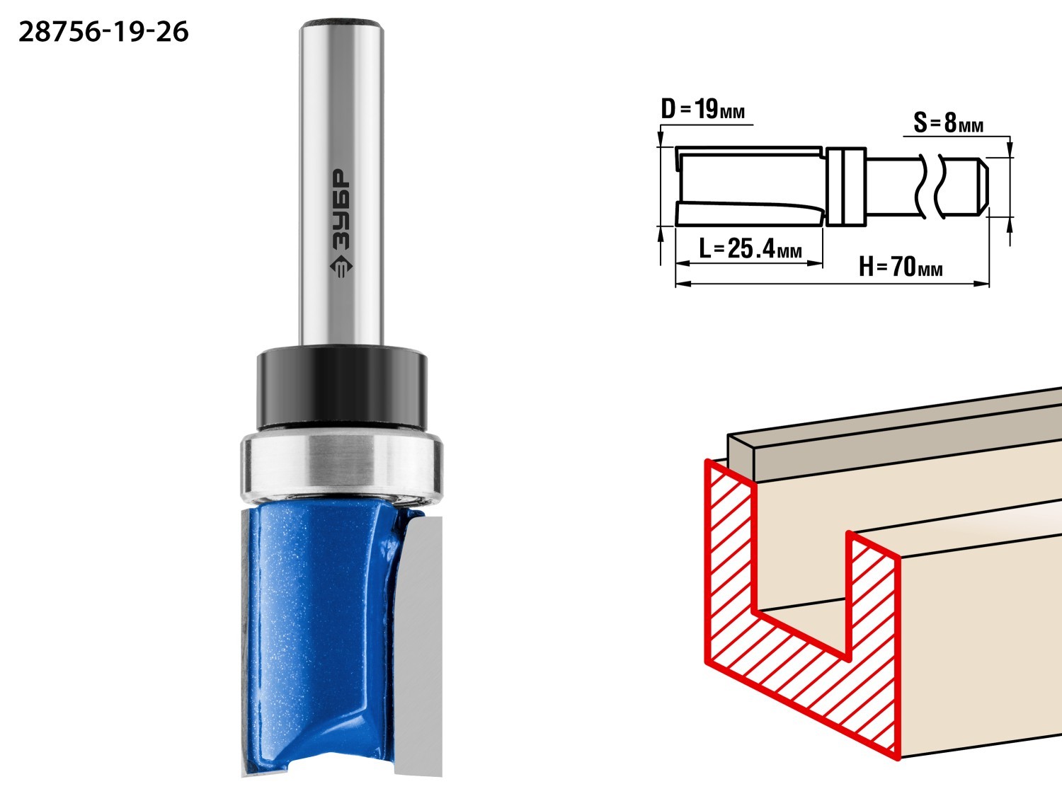 ЗУБР 19 x 26 мм, хвостовик 8 мм, фреза пазовая прямая с верхним подшипником, Профессионал (28756-19-26)