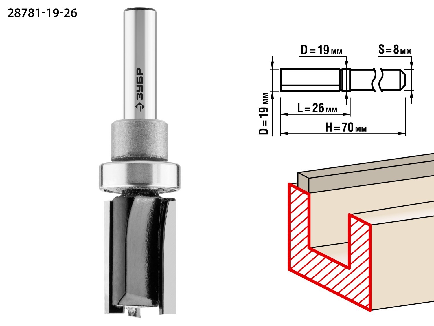 ЗУБР 19 x 26 мм, хвостовик 8 мм, фреза пазовая прямая с верхним подшипником, Профессионал (28781-19-26)