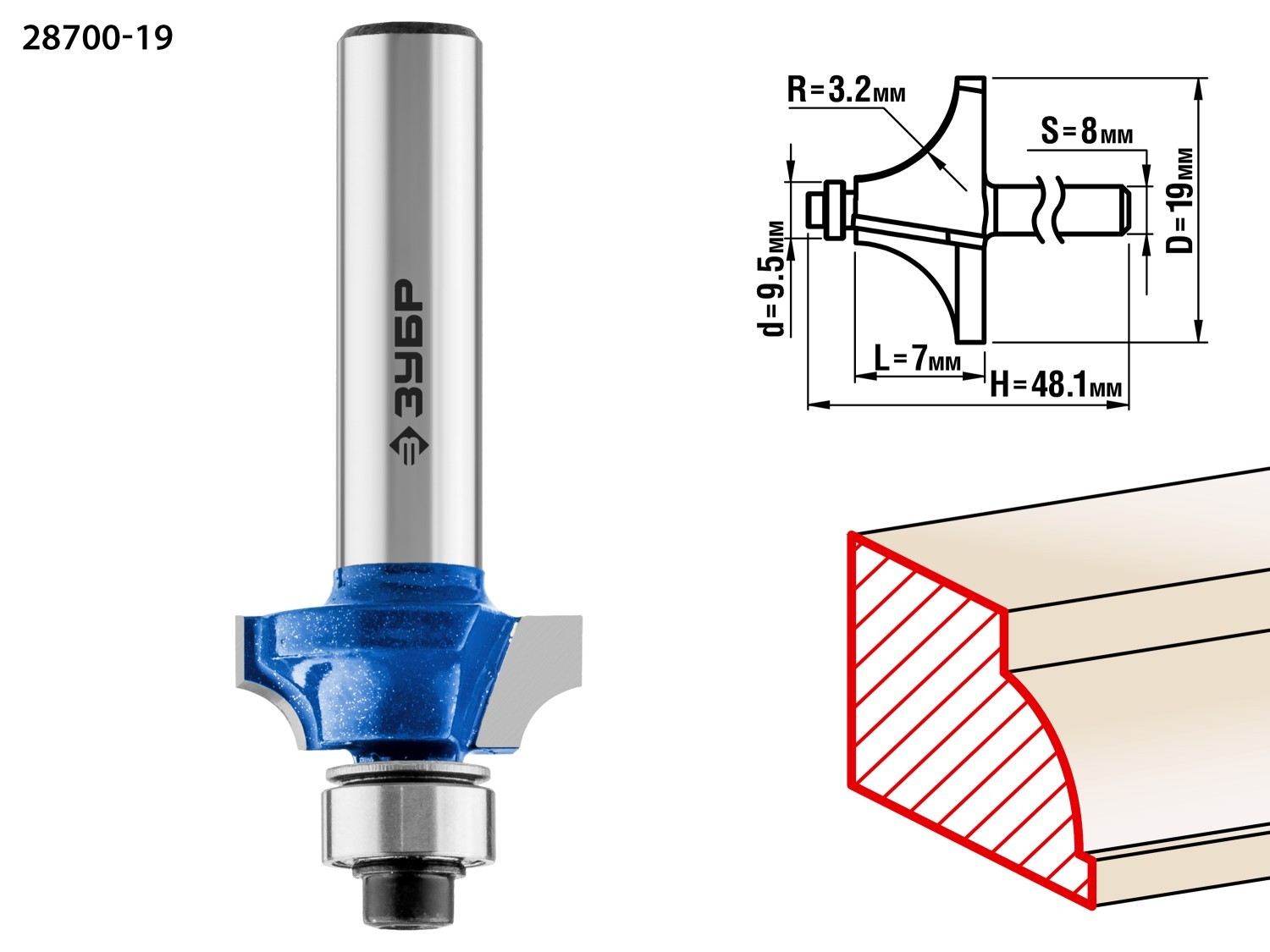 ЗУБР 19.0 x 7 мм, радиус 3.2 мм, фреза кромочная калевочная №1, Профессионал (28700-19)
