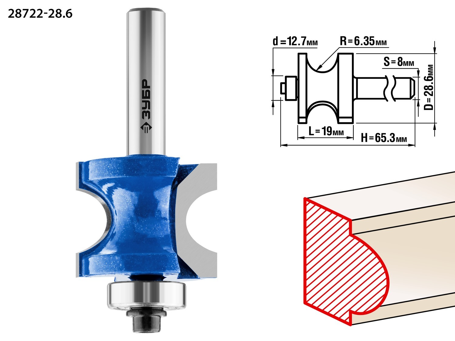 ЗУБР 28.6 x 19 мм, радиус 6.3 мм, фреза полустержневая с подшипником, Профессионал (28722-28.6)