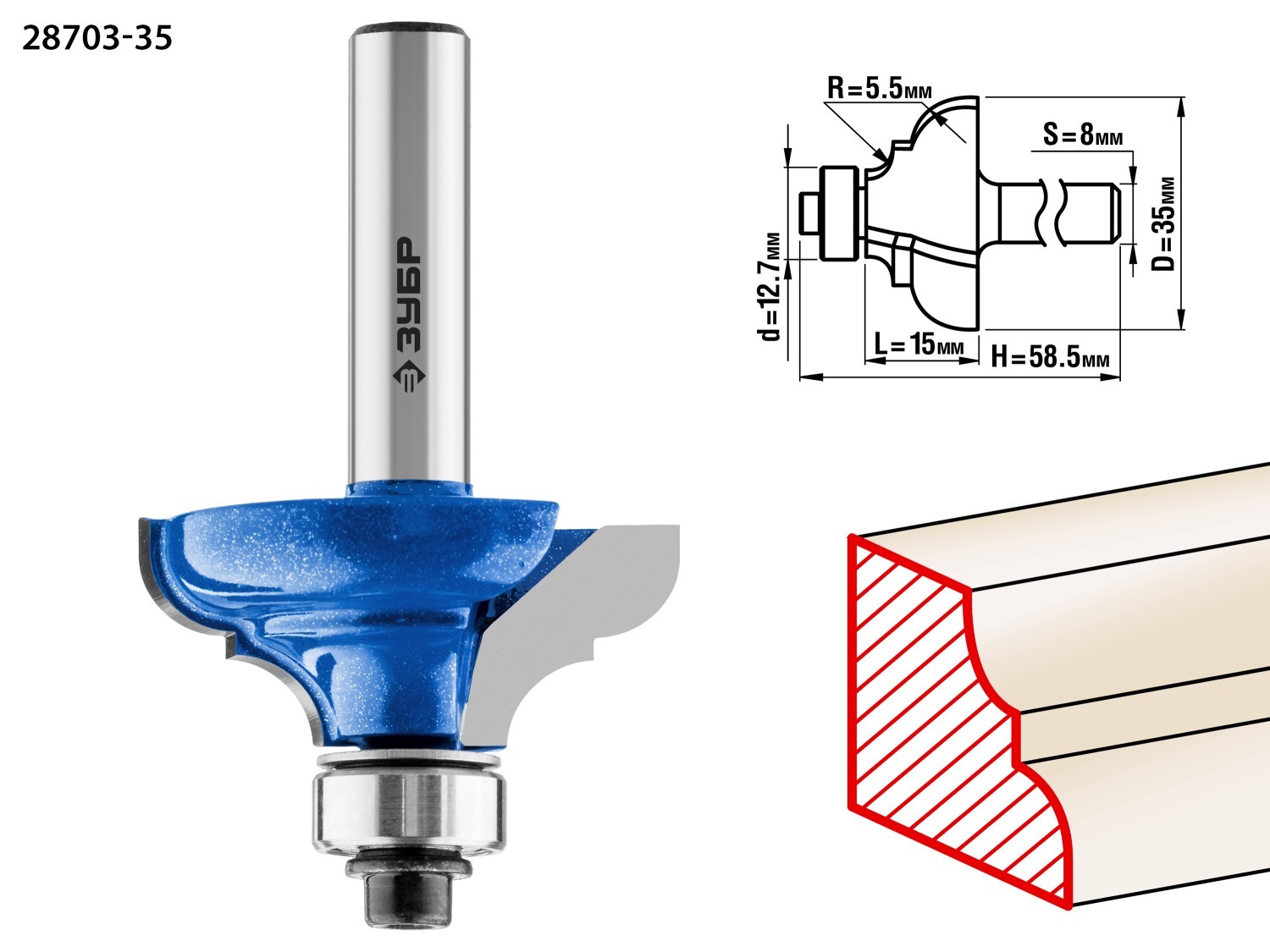 ЗУБР 35 x 17 мм, радиус 5.5 мм, фреза кромочная калевочная №3, Профессионал (28703-35)