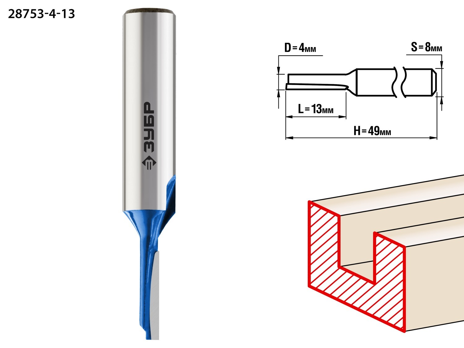 ЗУБР 4 x 13 мм, хвостовик 8 мм, фреза пазовая прямая, Профессионал (28753-4-13)