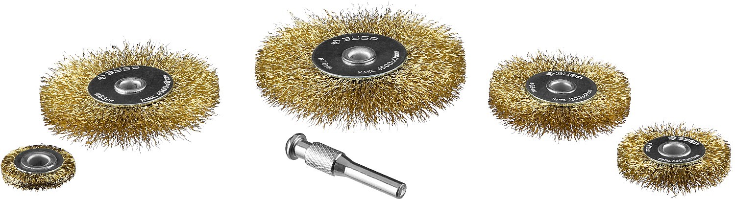 ЗУБР 5 шт, 25/40/55/63/78 мм, витая латунированная, стальная проволока, набор дисковых щеток-крацовок для дрели, Профессионал (3521-H5)