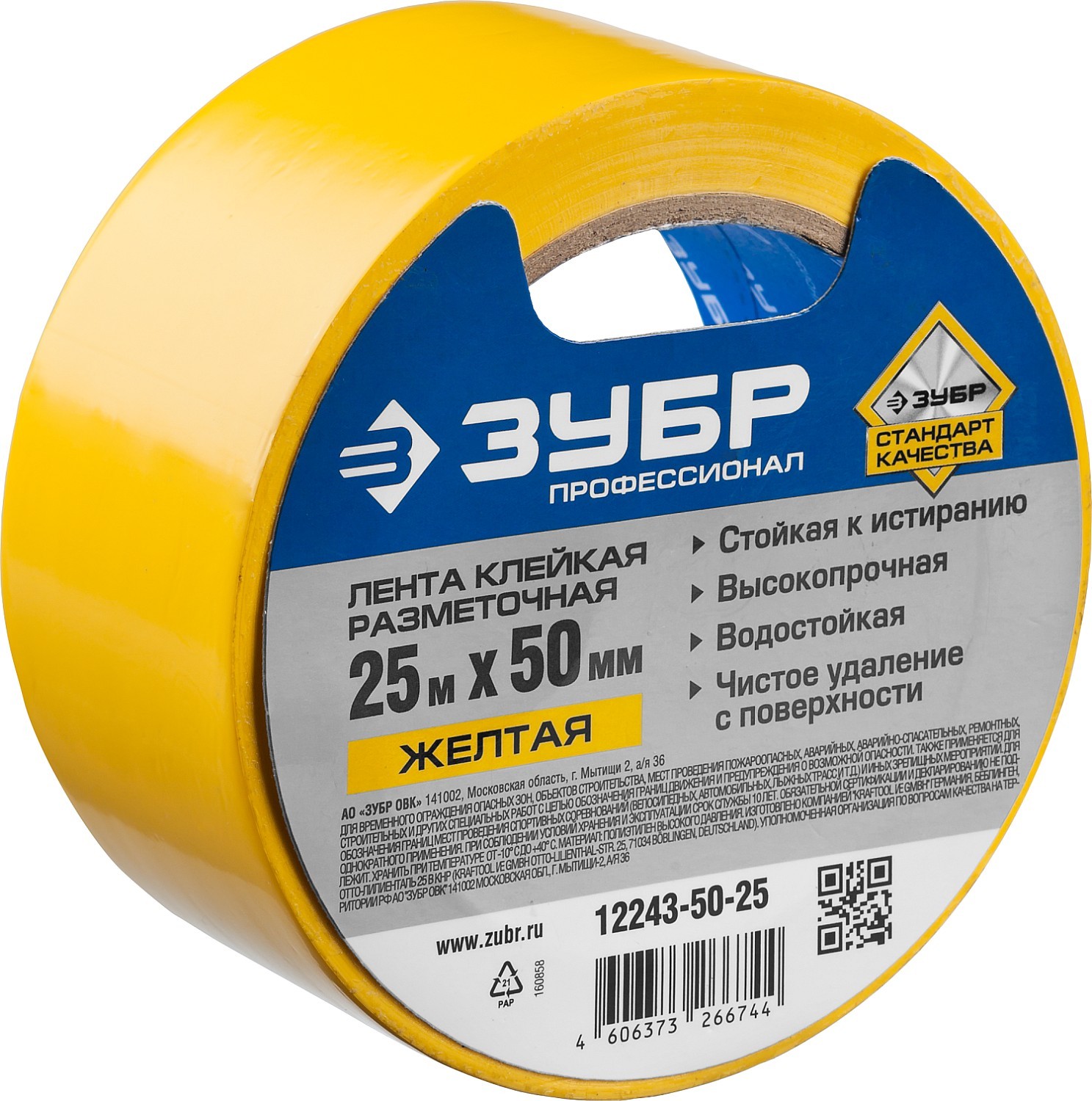 ЗУБР 50 мм, 25 м, желтая, разметочная клейкая лента, Профессионал (12243-50-25)