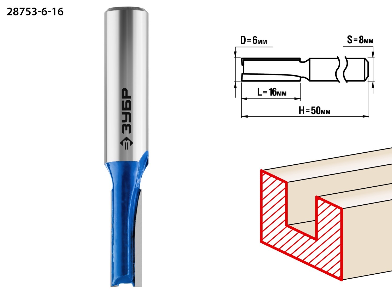 ЗУБР 6 x 16 мм, хвостовик 8 мм, фреза пазовая прямая, Профессионал (28753-6-16)
