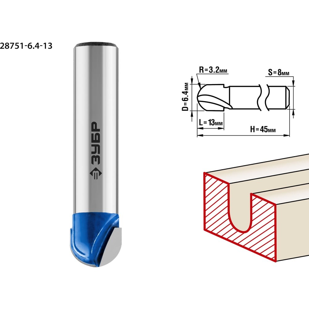 ЗУБР 6.4 x 13 мм, радиус 3.2 мм, фреза пазовая галтельная, Профессионал (28751-6.4-13)