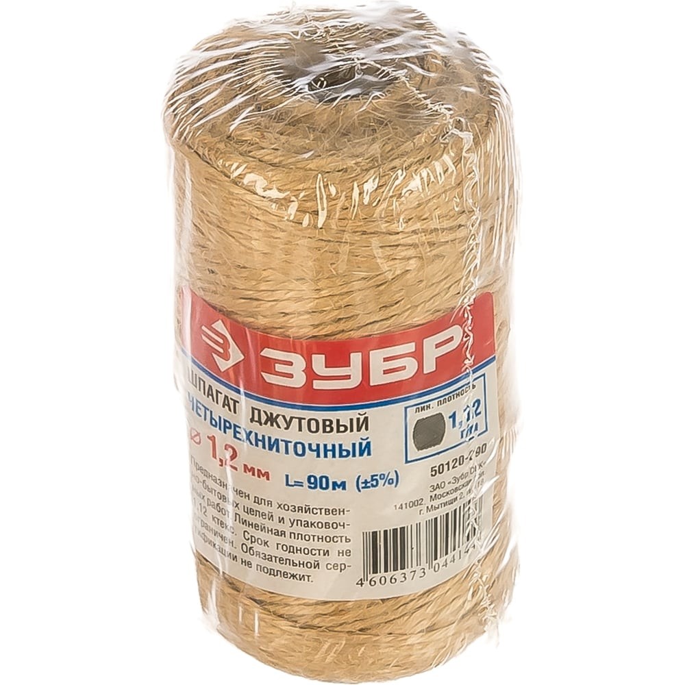 ЗУБР 90 м, 4-ниточный, d 1.2 мм, 1120 ктекс, 24 кгс, джутовый шпагат (50120-090)