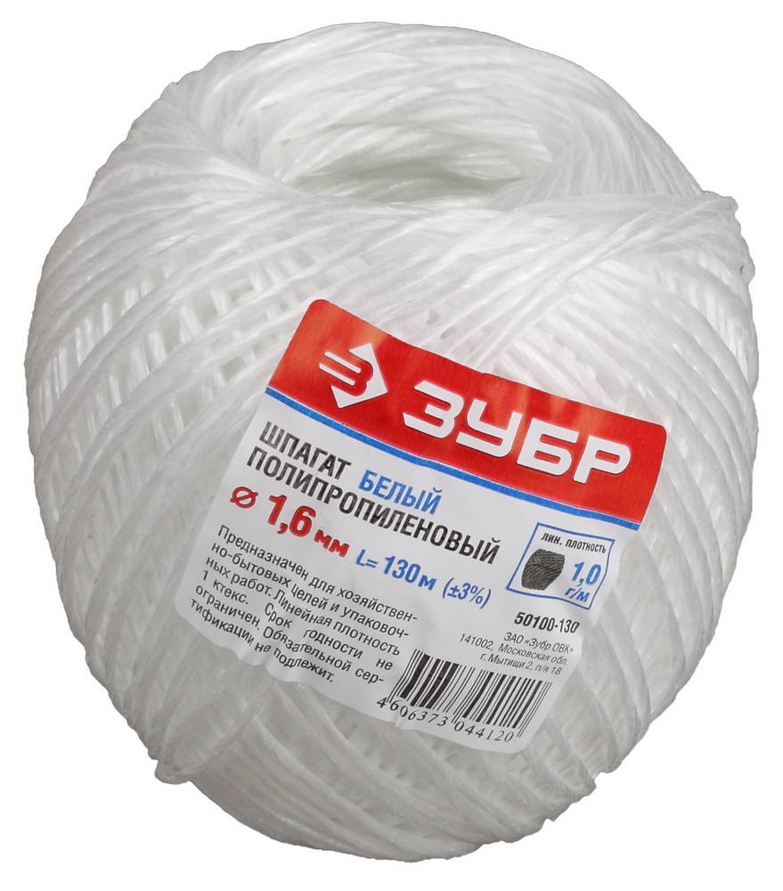 ЗУБР d 1.6 мм, 130 м, 1600 текс, 22 кгс, белый, полипропиленовый шпагат (50100-130)