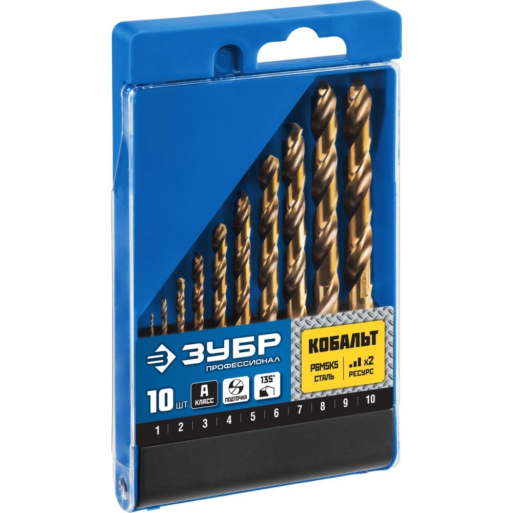 ЗУБР Кобальт, 10 шт, (1-10 мм), сталь Р6М5К5, класс А, набор сверл по металлу, Профессионал (29626-H10)